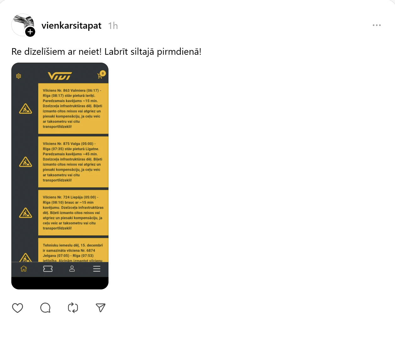 Tāpat PV atgādina, ka informāciju par izmaiņām vilcienu kustības grafikā pasažieri var uzzināt PV mobilajā lietotnē “Vivi Latvija”, kā arī PV mājaslapā “vivi.lv”, piebilstot, ka kontrolieri ir instruēti sniegt informāciju par notiekošo.