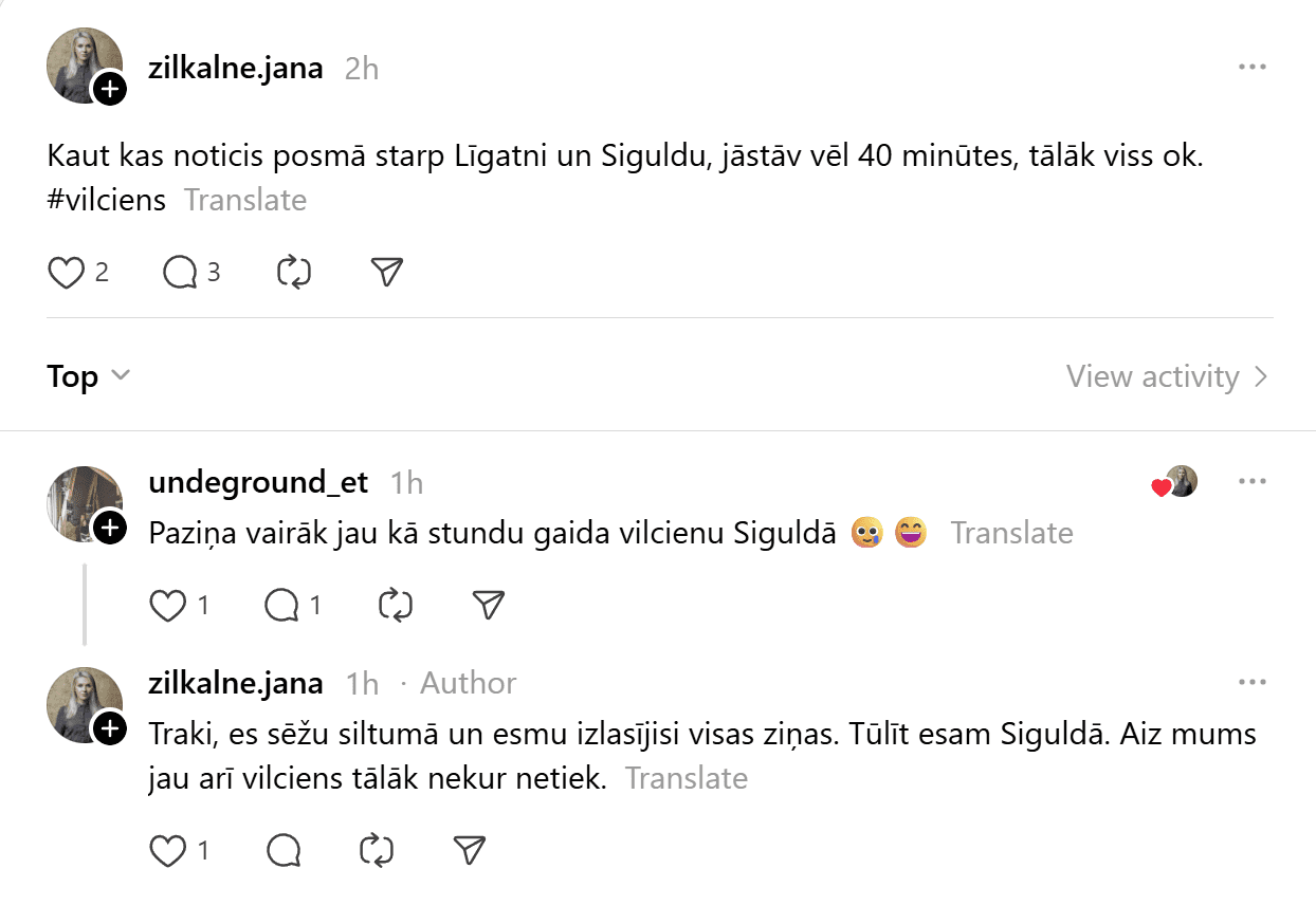 Tikmēr sociālajos tīklos parādījušies vairāki ieraksti, kuros cilvēki pauž neapmierinātību ar situāciju. Kāda sieviete raksta, ka arī posmā starp Līgatni un Siguldu vilciens stāv jau labu laiku, turklāt ziņots, ka stāvēs vēl vismaz 40 minūtes.