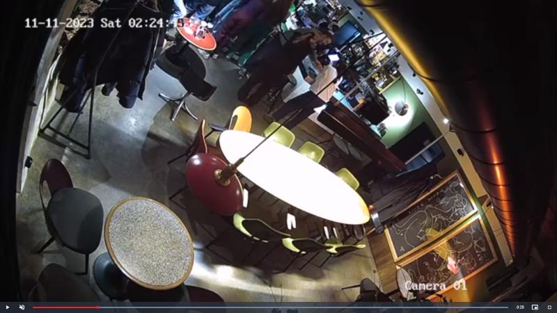 Sociālajos tīklos nonākušajā videonovērošanas kameras ierakstā redzams, ka vīrietis restorānā “Space Falafel” pie letes sarunājas ar divām sievietēm, līdz viena no viņām vīrietim iepliķē pa vaigu, bet tas pēc brīža apmeklētājai iesit pa galvu ar plaukstu.