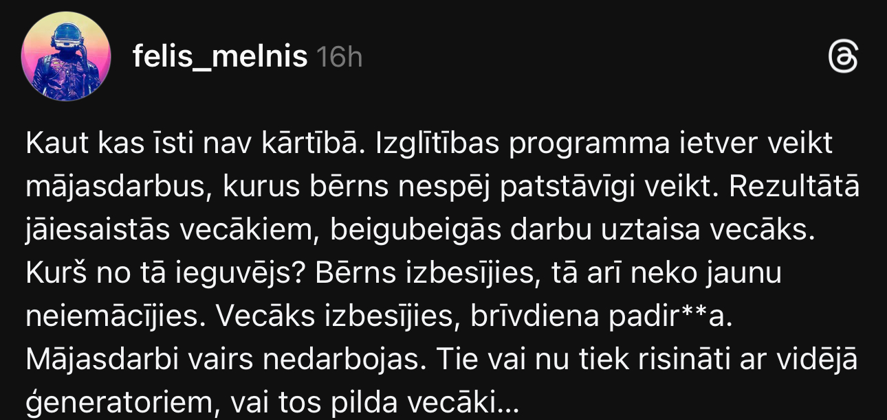 @felis_melnis raksta: “Kaut kas īsti nav kārtībā. Izglītības programma ietver veikt mājasdarbus, kurus bērns nespēj patstāvīgi veikt. Rezultātā jāiesaistās vecākiem, beigu beigās darbu uztaisa vecāks. Kurš no tā ieguvējs? Bērns izbesījies, tā arī neko jaunu neiemācījies. Vecāks izbesījies, brīvdiena vējā. Mājasdarbi vairs nedarbojas. Tie vai nu tiek risināti ar ģeneratoriem, vai tos pilda vecāki…”