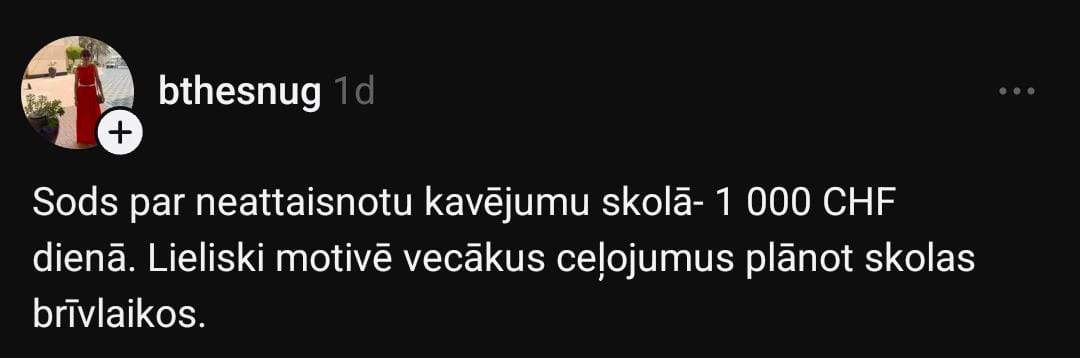 Tematu sociālajā mediju platformā “Threads” aktualizē Baiba, kura raksta: “Sods par neattaisnotu kavējumu skolā – 1 000 CHF dienā. Lieliski motivē vecākus ceļojumus plānot skolas brīvlaikos.” (Skaidrojam, ka CHF ir Šveices franks, kas ir aptuveni 1 092 eiro.)