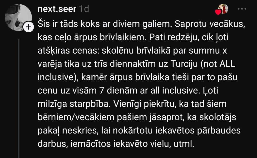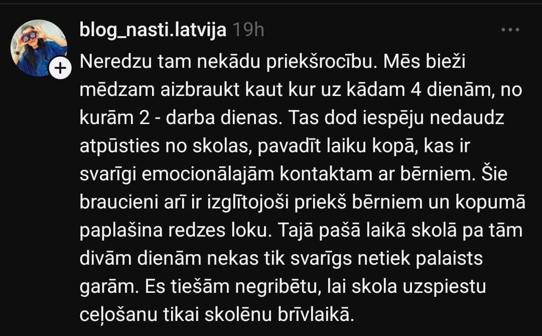 Savukārt Mārtiņš komentāru sadaļā raksta: “Labi, ka tāds stulbums nav pie mums ieviests. Vecāki paši spēj izlemt, vai bērns var doties ceļojumā un nedaudz kavēt mācības.”