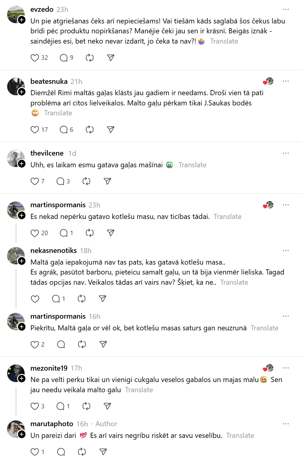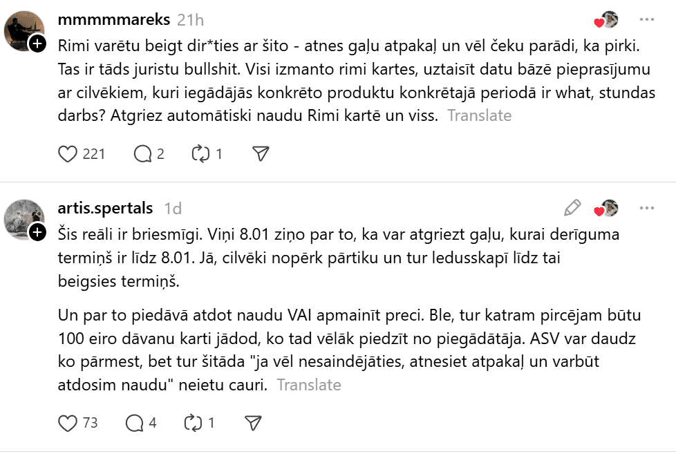 Cilvēki dalās gan ar bažām par pārtikas drošību, gan ar neizpratni par atsaukuma laiku un komunikāciju no veikala puses. Daudzi uzsver, ka paziņojums par preces atsaukšanu derīguma termiņa pēdējā dienā faktiski liedz iespēju savlaicīgi reaģēt un izvairīties no iespējamām veselības problēmām.