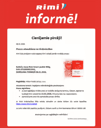 Par to veikals paziņoja uzņēmuma mājaslapā. “Rimi atsauc no tirdzniecības – Kotlešu masa Rimi Smart jauktā 400g. EAN kods 4752050022933, derīguma termiņš 08.01.2026. Piegādātājs: Hilton Foods Ltd sp. z o.o.