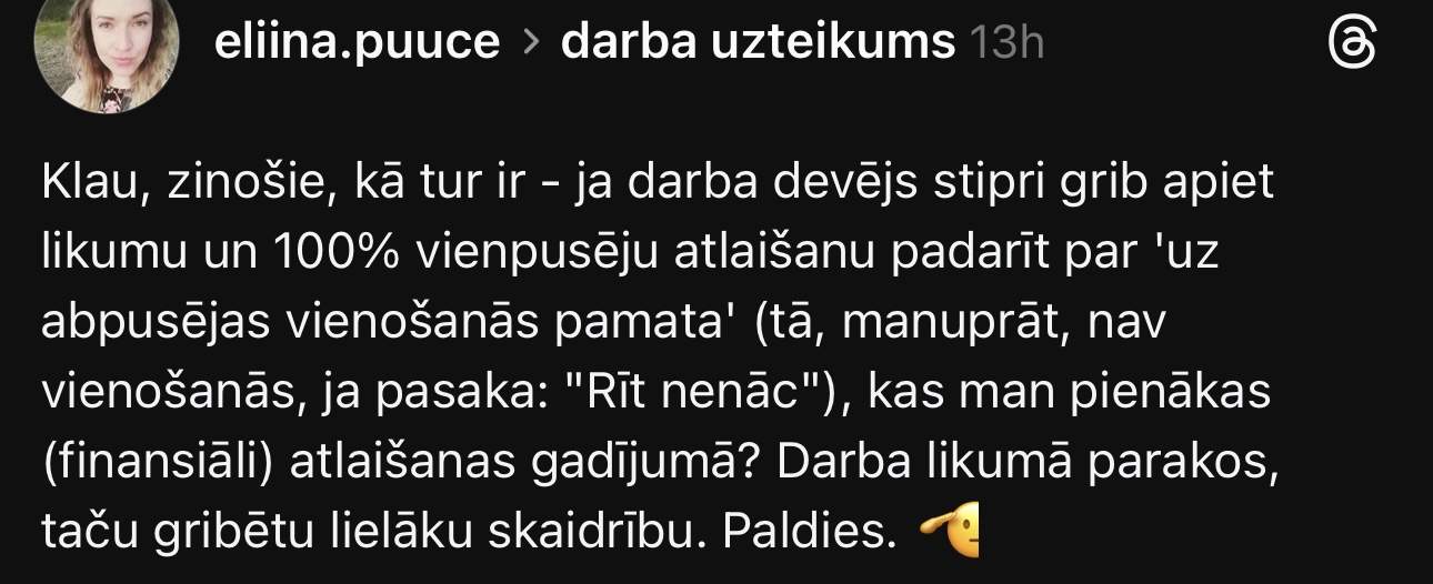 Arī sociālo mediju lietotāji par šo runā. Elīna “Threads” jautā: “Klau, zinošie, kā tur ir – ja darba devējs stipri grib apiet likumu un 100% vienpusēju atlaišanu padarīt par “uz abpusējas vienošanās pamata” (tā, manuprāt, nav vienošanās, ja pasaka: “Rīt nenāc”), kas man pienākas (finansiāli) atlaišanas gadījumā?”
