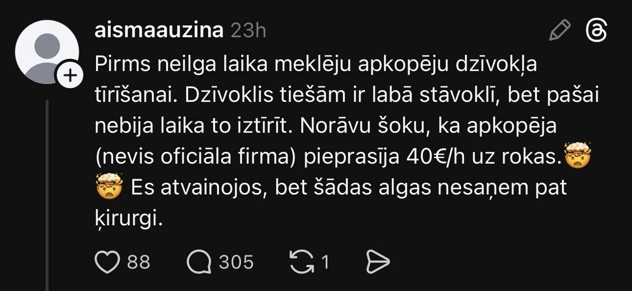 Aisma soctīklā “Threads” raksta: “Pirms neilga laika meklēju apkopēju dzīvokļa tīrīšanai. Dzīvoklis tiešām ir labā stāvoklī, bet pašai nebija laika to iztīrīt. Norāvu šoku, ka apkopēja (nevis oficiāla firma) pieprasīja 40 eiro/h uz rokas. Es atvainojos, bet šādas algas nesaņem pat ķirurgi.” Konkrētais pakalpojums viņai izmaksājis 160 eiro par četru stundu darbu 40 kvadrātmetru dzīvoklī.
