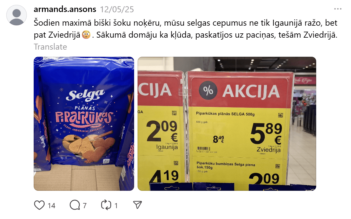 “Šodien “Maximā” bišķi noķēru šoku, mūsu “Selgas” cepumus ne tikai Igaunijā ražo, bet pat Zviedrijā. Sākumā domāju, ka kļūda, paskatījos uz paciņas, tiešām Zviedrijā,” rakstīja kāds iedzīvotājs sociālajā tīklā “Threads”.