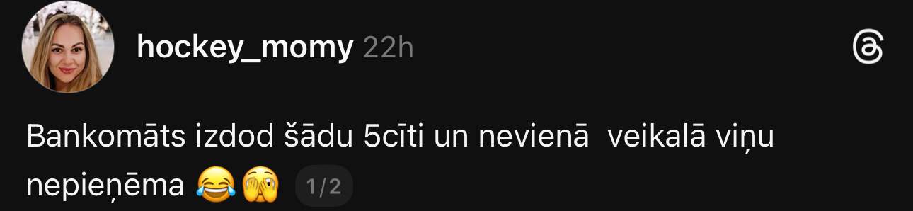 Sieviete vietnē “Threads” dalījusies ar attēlu, kurā redzama 5 eiro banknote. Viņa raksta, ka tādu izdevis bankomāts. Naudas vienība šādā stadijā neesot pieņemta nevienā veikalā.
