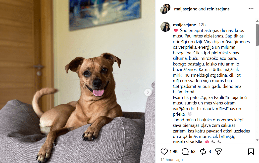 Viņa vietnē “Instagram” raksta: “Šodien aprit astoņas dienas, kopš mūsu Paulīnītes aiziešanas. Sāp tik asi, griezīgi un dziļi. Viņa bija mūsu ģimenes dzīvesprieks, enerģija un mīļuma bezgalība. Cik stipri pietrūkst viņas siltuma, buču, mirdzošo acu pāra, kopīgo pastaigu, laisko rītu ar mīļo bužināšanos.