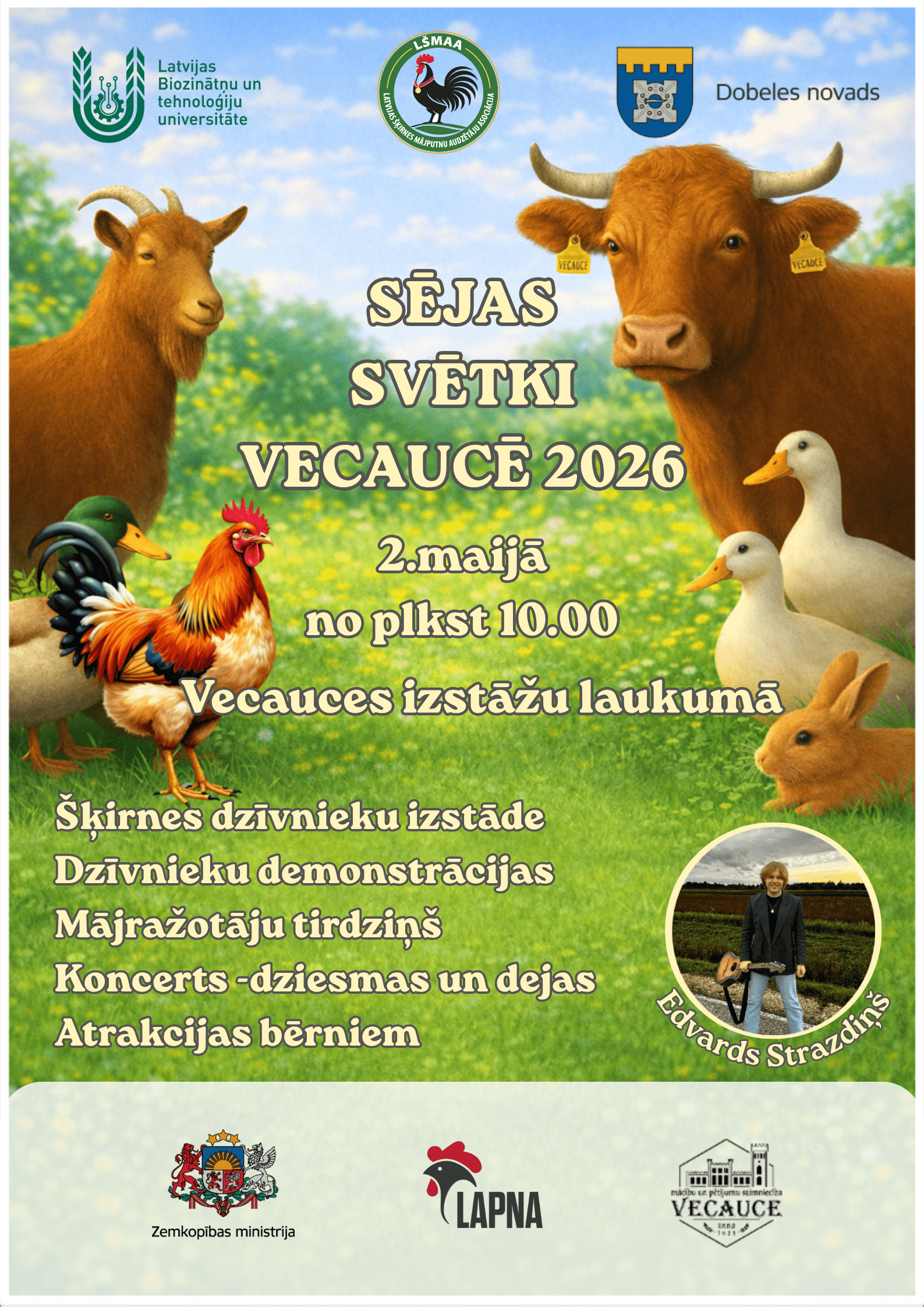 Jau 2026. gada 2. maijā no plkst. 10.00 Vecauces izstāžu laukumā notiks pasākums “Sējas svētki Vecaucē 2026”, kas vienkopus pulcēs lauksaimniecības nozares profesionāļus, zinātniekus, studentus un plašu sabiedrību. Pasākuma mērķis ir stiprināt Latvijas lauksaimniecības dzīvnieku ģenētisko resursu saglabāšanu, vienlaikus atjaunojot Vecaucē vēsturiski nozīmīgo lauksaimniecības izstāžu tradīciju. Pasākums veidots kā platforma, kur vienkopus satiekas lauksaimniecības dzīvnieku audzētāji, zinātnieki, izglītības iestādes un sabiedrība, veicinot zināšanu apmaiņu un nozares attīstību.