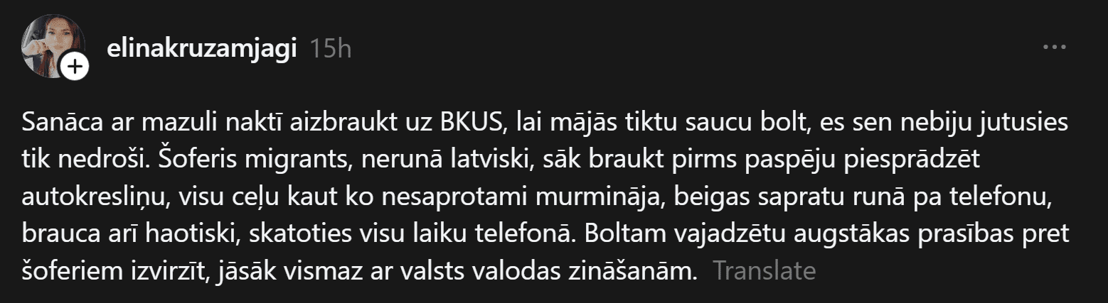 “Sanāca ar mazuli naktī aizbraukt uz BKUS, lai mājās tiktu, saucu Bolt. Es sen nebiju jutusies tik nedroši. Šoferis migrants, nerunā latviski, sāk braukt, pirms paspēju piesprādzēt autokrēsliņu, visu ceļu kaut ko nesaprotami murmināja, beigās sapratu – runā pa telefonu. Brauca arī haotiski, visu laiku skatoties telefonā. Boltam vajadzētu izvirzīt augstākas prasības šoferiem, jāsāk vismaz ar valsts valodas zināšanām.