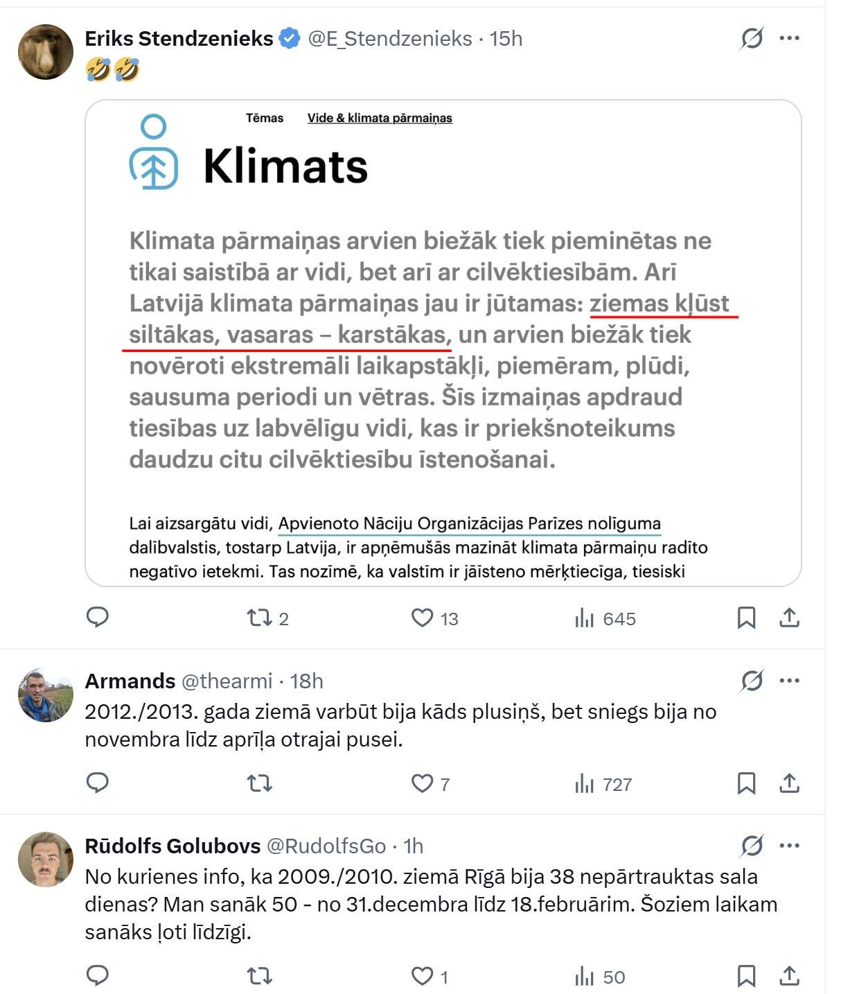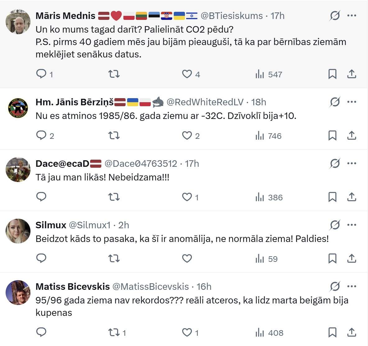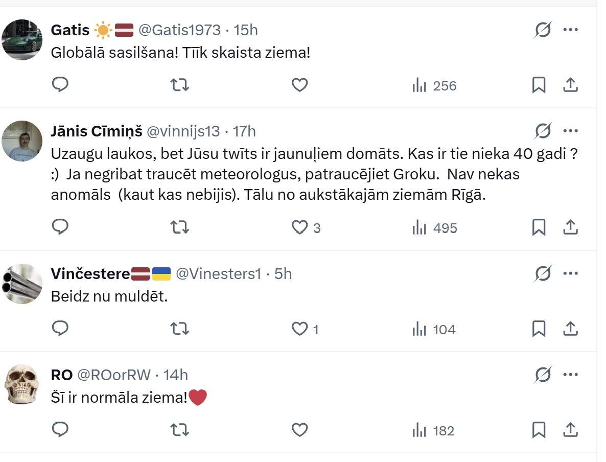 Viņš raksta: “Šī ziema Rīgā ir pārspējusi pēdējo 40 gadu rekordu pēc ilgākā nepārtrauktā dienu skaita, kad dienas maksimālā temperatūra nepārsniedza 0°C.