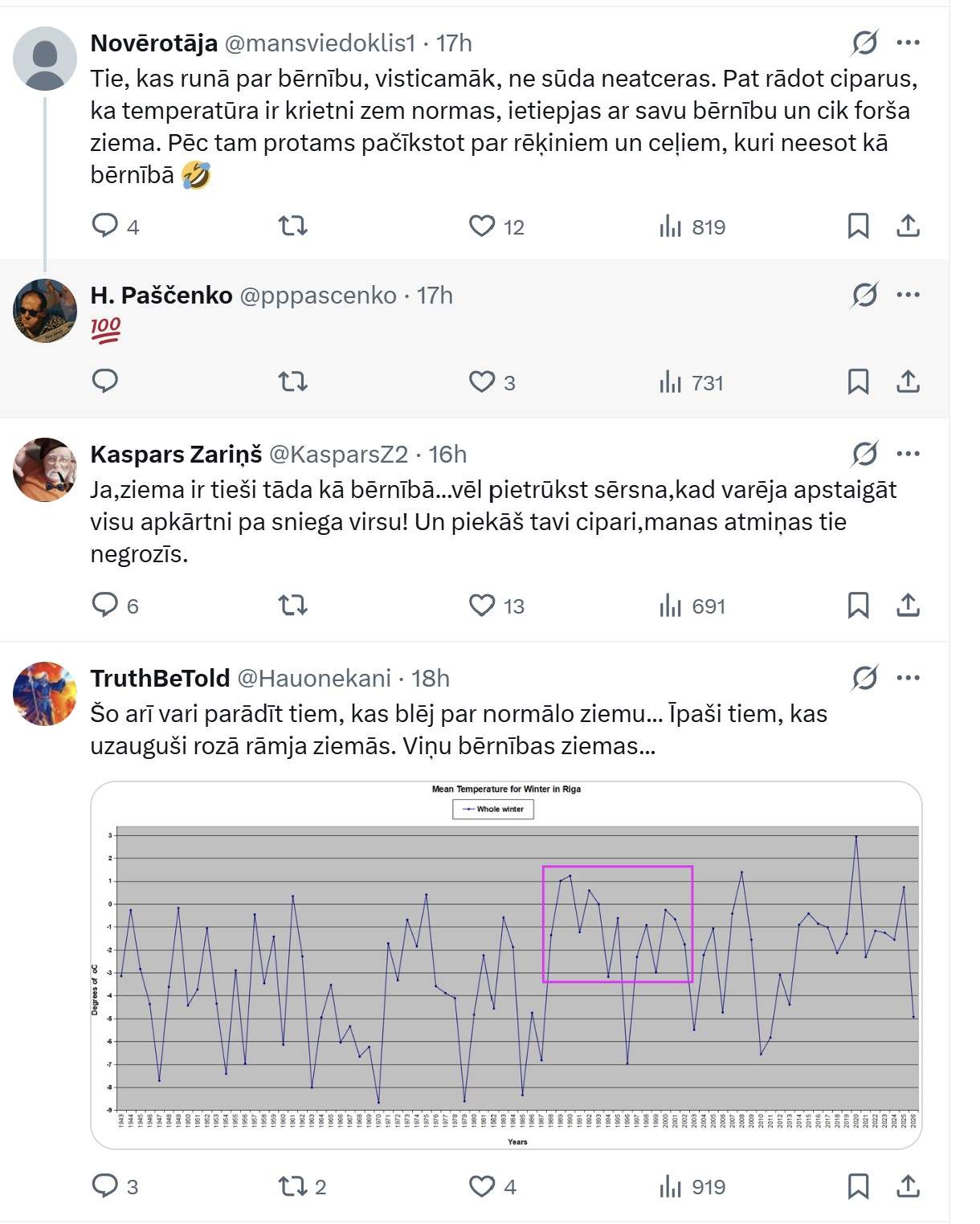 Šis ieraksts ir domāts tiem, kuri apgalvo, ka tā esot “normāla ziema kā bērnībā”. Nē, tā nav nekāda normāla ziema — ja vien jūsu bērnība nav pagājusi Mazā ledus laikmeta laikos