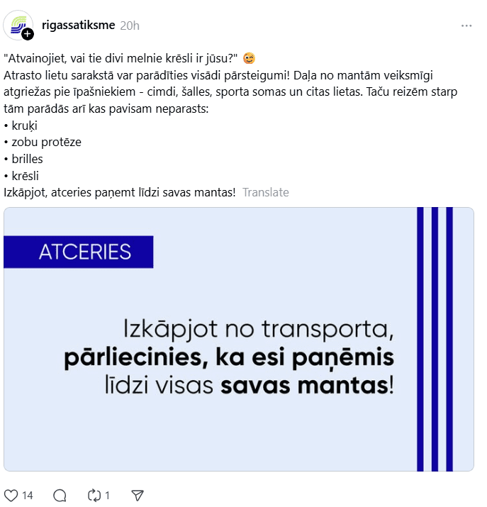 Katrs no mums vismaz reizi ir braucis ar sabiedrisko transportu, citiem tā ir ikdienišķa nodarbe, tāpēc nav brīnums, ka var gadīties ko sabiedriskajā transportā arī aizmirst. Rīgas Satiksme” komiskā veidā braucējiem soctīklos atgādina, ka, pirms izkāpšanas no transporta, jāpārbauda, vai visas mantas ir paņemtas līdzi.