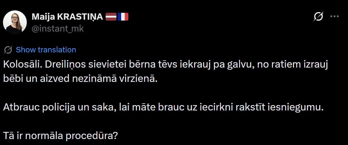 “Kolosāli. Dreiliņos sievietei bērna tēvs iekrauj pa galvu, no ratiem izrauj bēbi un aizved nezināmā virzienā. Atbrauc policija un saka, lai māte brauc uz iecirkni rakstīt iesniegumu. Tā ir normāla procedūra?” vietnē “X” raksta Maija.
