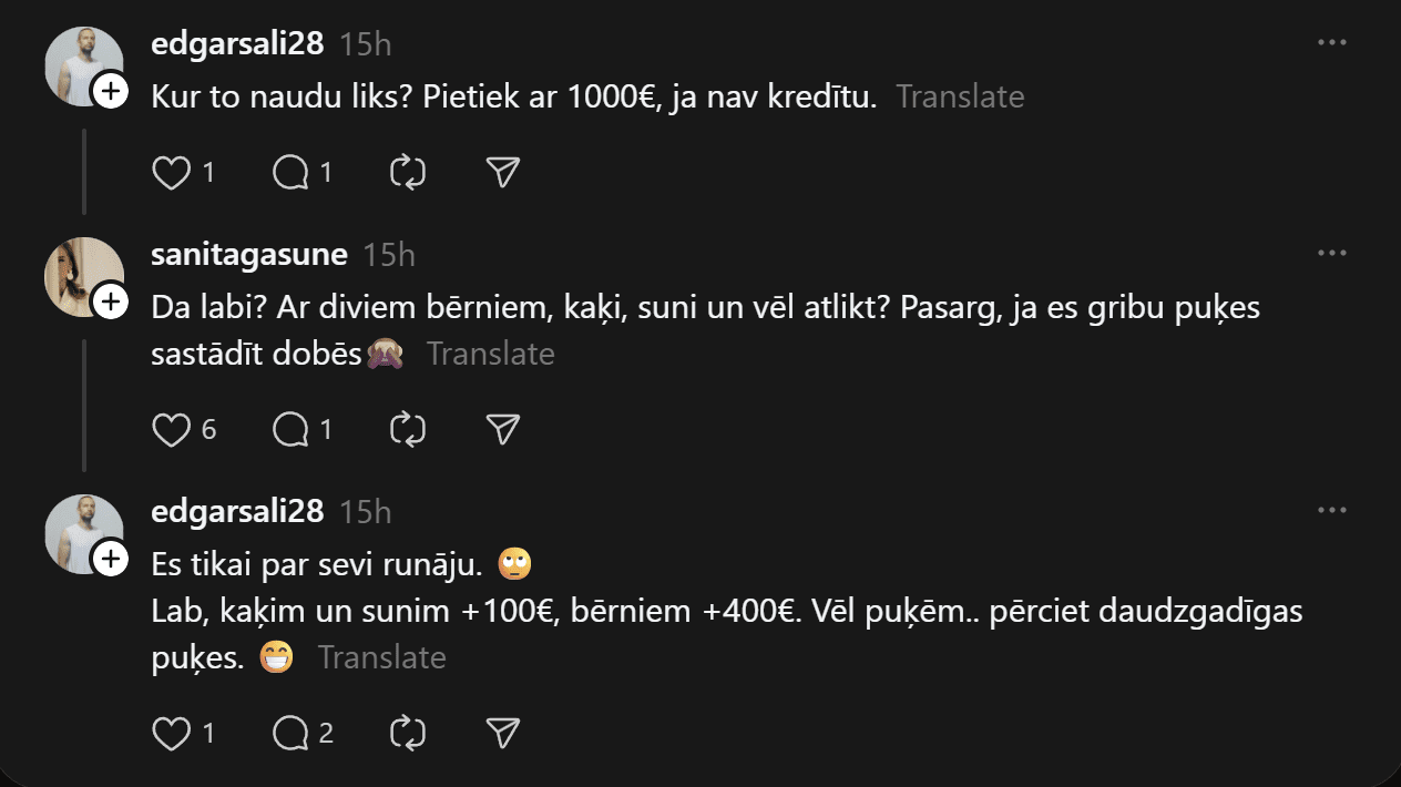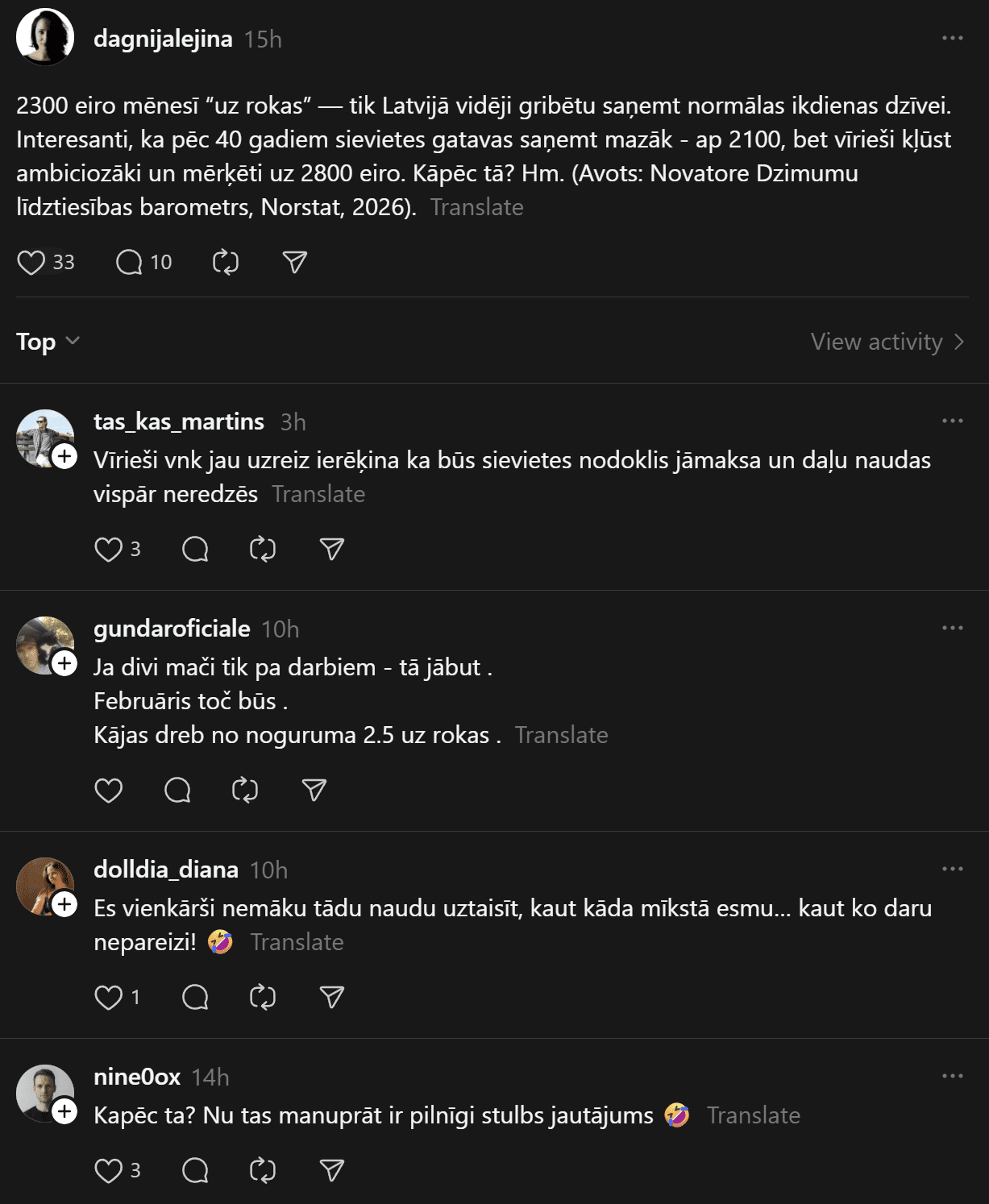 “2300 eiro mēnesī “uz rokas” — tik Latvijā vidēji gribētu saņemt normālas ikdienas dzīvei. Interesanti, ka pēc 40 gadiem sievietes gatavas saņemt mazāk – ap 2100, bet vīrieši kļūst ambiciozāki un mērķēti uz 2800 eiro. Kāpēc tā? Hm. (Avots: Novatore Dzimumu līdztiesības barometrs, Norstat, 2026),” Dagnija raksta.