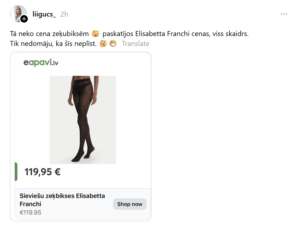 Sieviete raksta: “Tā neko cena zeķbiksēm. Paskatījos Elisabetta Franchi cenas, viss skaidrs. Tik nedomāju, ka šīs neplīst.”