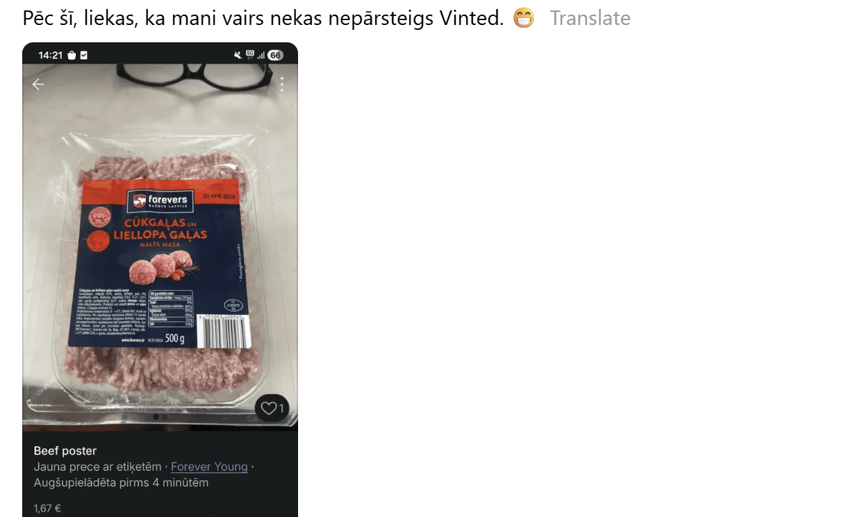 “Pēc šī, liekas, ka mani vairs nekas nepārsteigs “Vinted”,” raksta kāda sociālā tīkla “Threads” lietotāja, reaģējot uz kārtējo neparasto sludinājumu populārajā lietoto apģērbu pārdošanas platformā. Šoreiz pārsteigumu izraisījis piedāvājums iegādāties “Forevers” zīmola cūkgaļas un liellopa maltās gaļas produktu – lieta, kas šķiet pilnīgi ārpus platformas ierastā fokusa uz apģērbu un aksesuāriem.