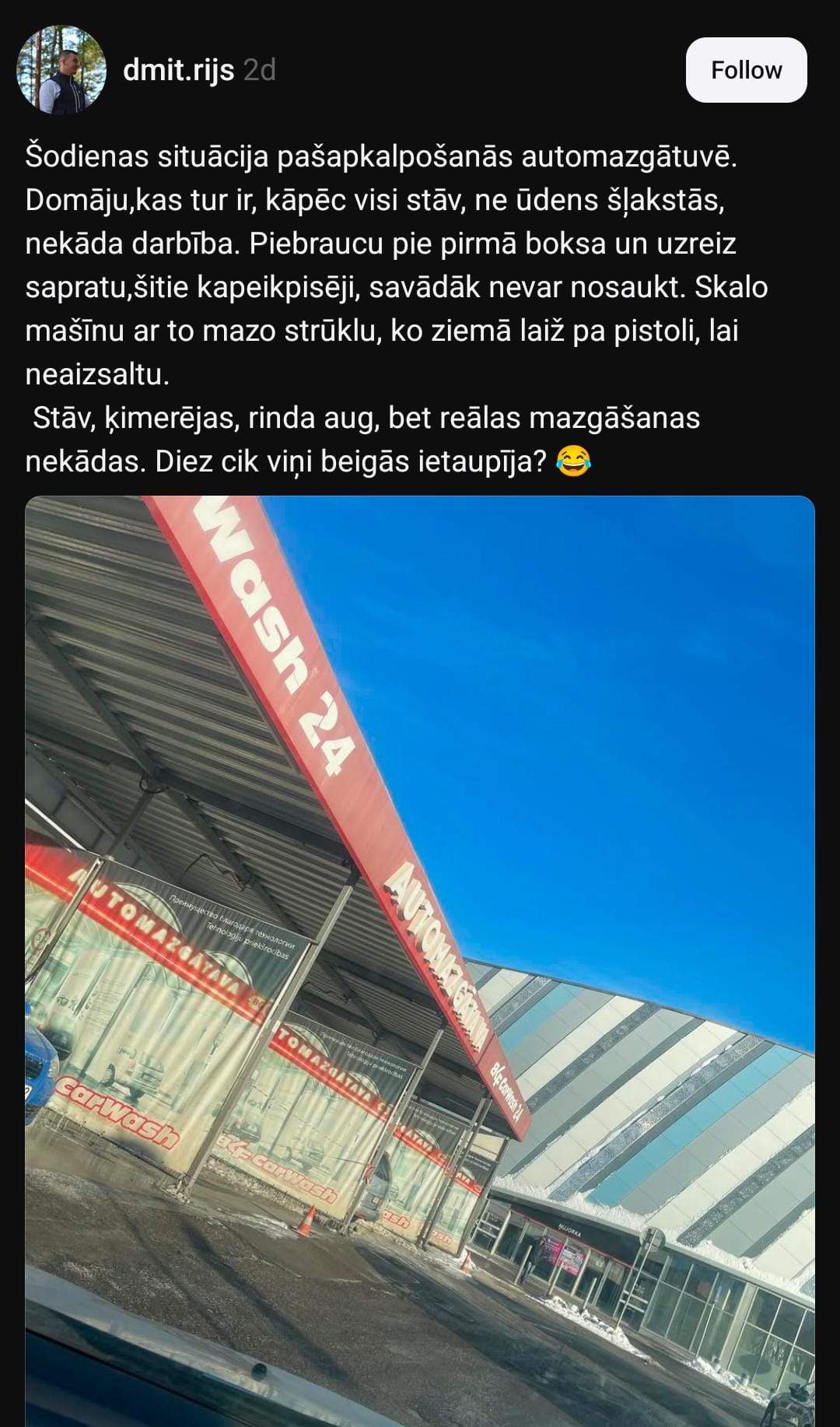“Šodienas situācija pašapkalpošanās automazgātavā. Domāju – kas tur notiek, kāpēc visi stāv? Ūdens nešļakstās, nekādas darbības. Piebraucu pie pirmā boksa un uzreiz sapratu – šitie kapeik*isēji, citādi nevar nosaukt. Skalo mašīnu ar to mazo strūklu, ko ziemā laiž pa pistoli, lai neaizsaltu,” raksta ieraksta autors.