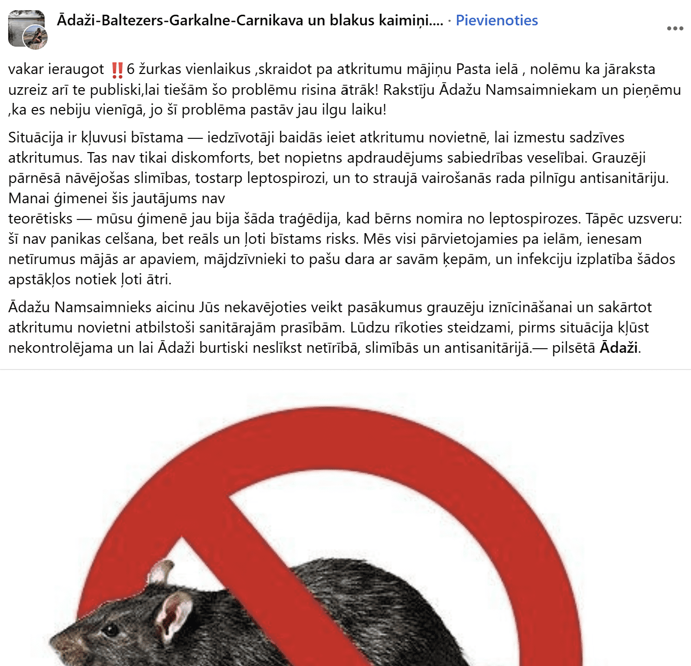 “Vakar ieraugot 6 žurkas vienlaikus, skraidot pa atkritumu mājiņu Pasta ielā, nolēmu ka jāraksta uzreiz arī te publiski, lai tiešām šo problēmu risina ātrāk! Rakstīju “Ādažu Namsaimniekam” un pieņēmu, ka es nebiju vienīgā, jo šī problēma pastāv jau ilgu laiku!