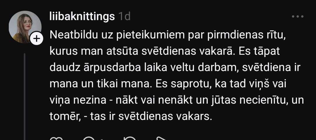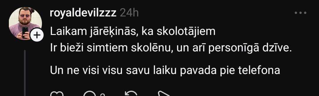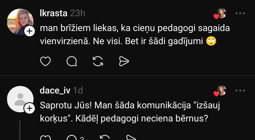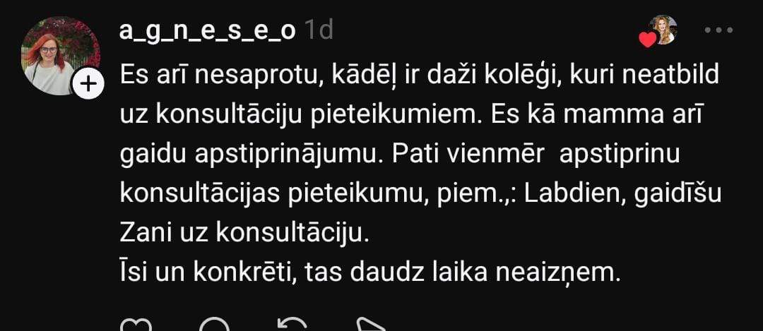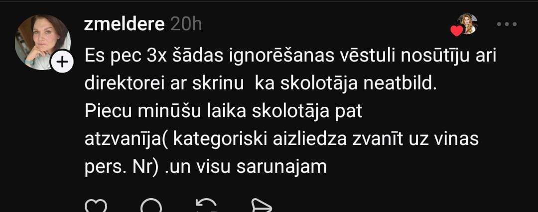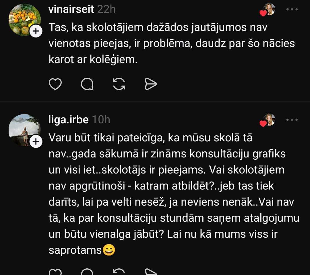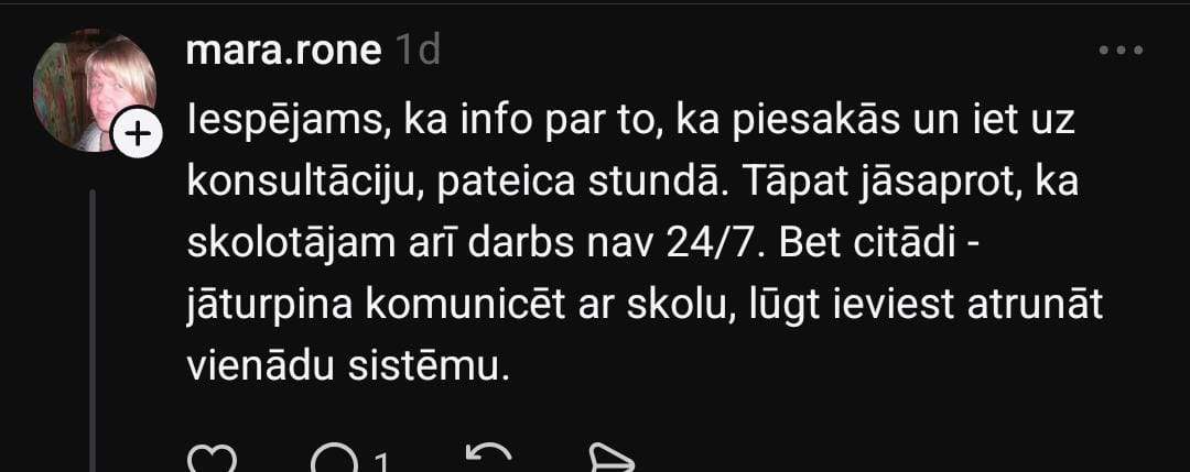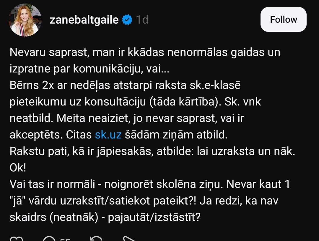 Zane sociālo mediju platformā “Threads” dalās savā pieredzē: “Nevaru saprast, man ir kaut kādas nenormālas gaidas un izpratne par komunikāciju, vai… Bērns 2 reizes ar nedēļas atstarpi raksta skolotājai e-klasē pieteikumu uz konsultāciju (tāda kārtība). Skolotāja vienkārši neatbild. Meita neaiziet, jo nevar saprast, vai ir akceptēts. Citas skolotājas uz šādām ziņām atbild. Rakstu pati, kā ir jāpiesakās, atbilde: lai uzraksta un nāk. Ok!”