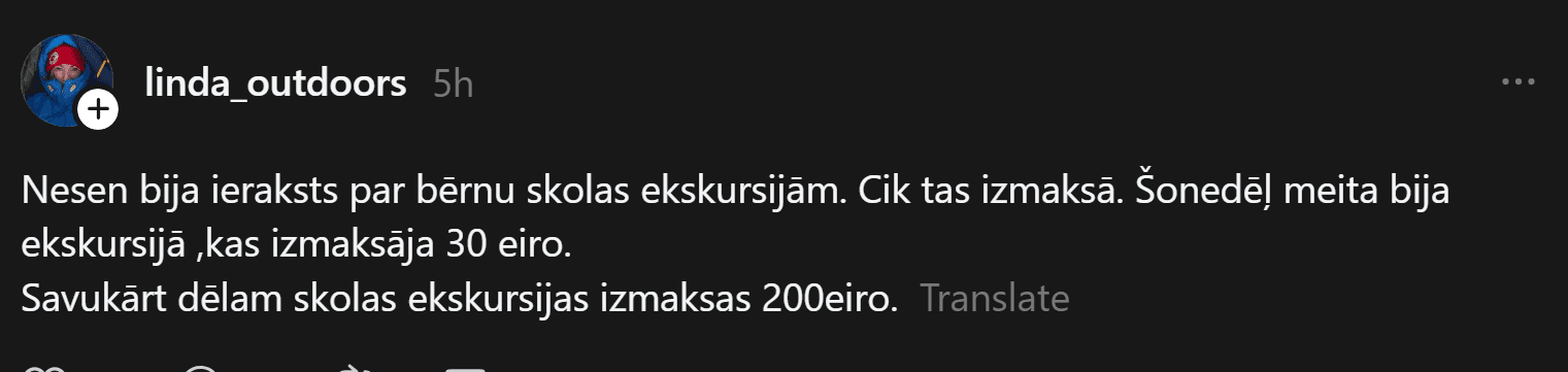 Tomēr pēdējā laikā ir aktualizējies jautājums par ekskursiju izmaksām. Kāda māmiņa vietnē “Threads” raksta: “Nesen bija ieraksts par bērnu skolas ekskursijām. Cik tas izmaksā. Šonedēļ meita bija ekskursijā, kas izmaksāja 30 eiro. Savukārt dēlam skolas ekskursijas izmaksas – 200 eiro.”