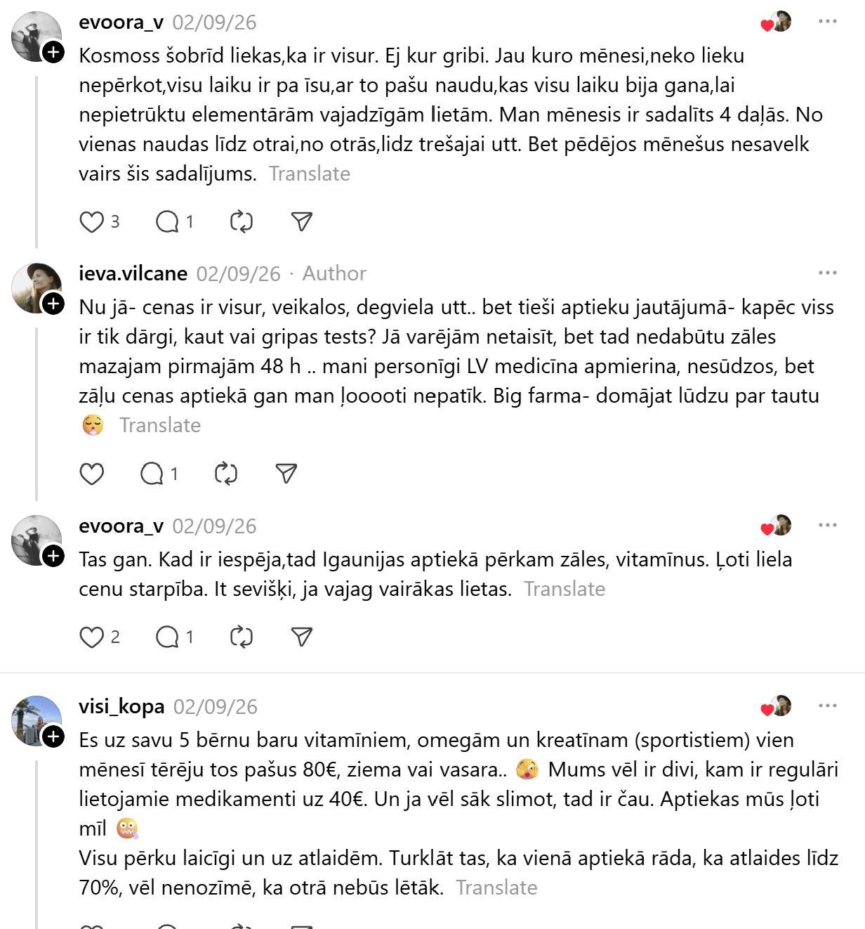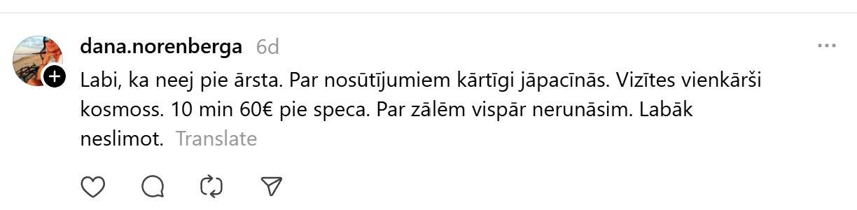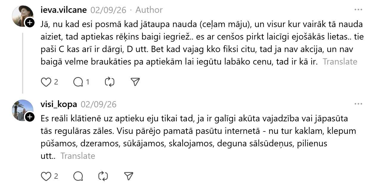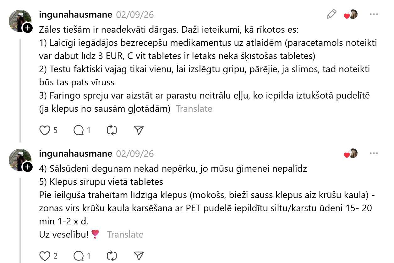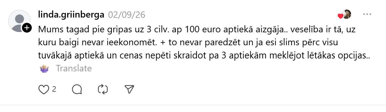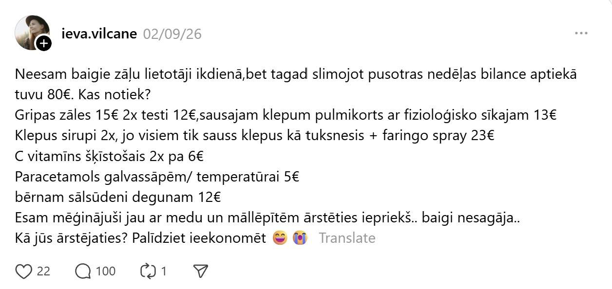 Bet vai jūtam to realitātē? Katram noteikti ir savi secinājumi, bet nelielas daļas sabiedrības viedokļa var “sadzirdēt” pie Ievas ieraksta soctīklā “Threads”. Viņa raksta: “Neesam baigie zāļu lietotāji ikdienā, bet tagad slimojot pusotras nedēļas bilance aptiekā tuvu 80€. Kas notiek? Gripas zāles 15€ 2x testi 12€,sausajam klepum pulmikorts ar fizioloģisko sīkajam 13€,