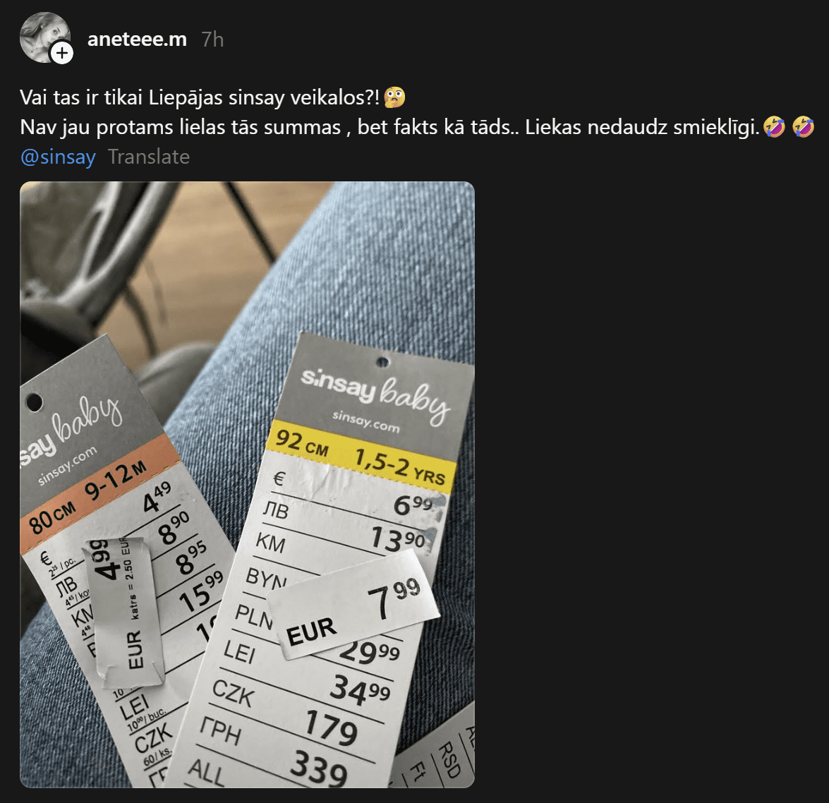 “Vai tas ir tikai Liepājas “Sinsay” veikalos?! Nav jau, protams, lielas tās summas, bet fakts kā tāds.. Liekas nedaudz smieklīgi,” ar pieredzēto dalās Anete. Viņas publicētajā fotogrāfijā redzams, kā uz “Sinsay” cenu birkām pa virsu ir uzlīmētas jaunas – augstāku cenu uzlīmes.