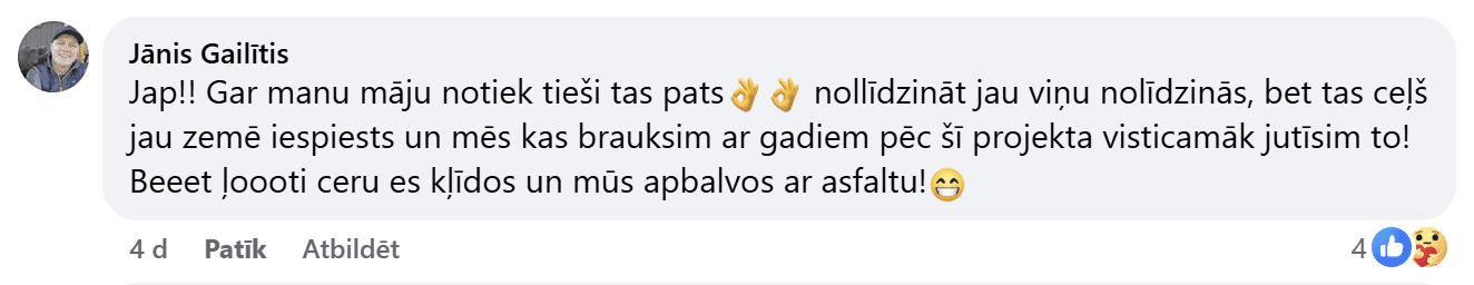 Lai gan visiem redzams, ka situācija uz ceļa ir kritiska, Smiltenes novada pašvaldības Komunikācijas nodaļas vadītāja Linda Fronta uz LA.LV lūgumu sniegt komentāru, kad šī situācija tiks novērsta atbild, norādot, ka gan iedzīvotājiem, gan pašvaldībai ir svarīgi saglabāt ceļu kvalitāti gan tā izveides, gan pēc tā nodošanas ekspluatācijā.
