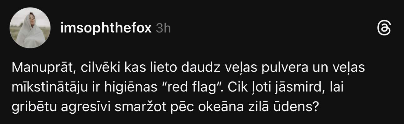 Sofija dalās viedoklī: “Manuprāt, cilvēki, kas lieto daudz veļas pulvera un veļas mīkstinātāju, ir higiēnas “red flag”. Cik ļoti jāsmird, lai gribētu agresīvi smaržot pēc okeāna zilā ūdens?”