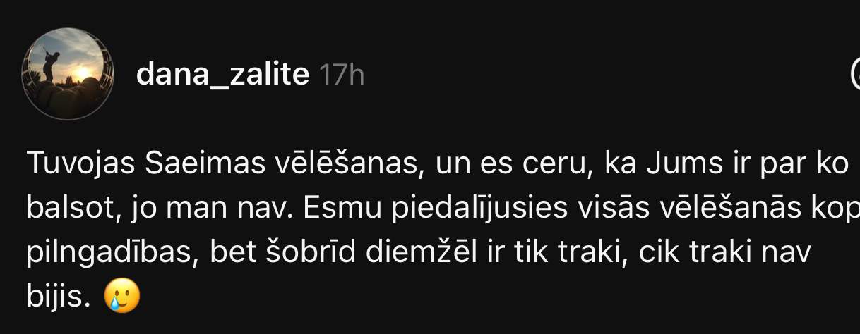 Šādā situācijā šobrīd nonākusi arī Dana. Viņa sociālajā tīklā “Threads” raksta, ka ir pildījusi savu pilsoņa pienākumu un balsojusi kopš pilngadības. Taču šobrīd situācija, viņasprāt, ir vissliktākā. “Tuvojas Saeimas vēlēšanas, un es ceru, ka jums ir par ko balsot, jo man nav. Esmu piedalījusies visās vēlēšanās kopš pilngadības, bet šobrīd diemžēl ir tik traki, cik traki nav bijis,” raksta Dana.