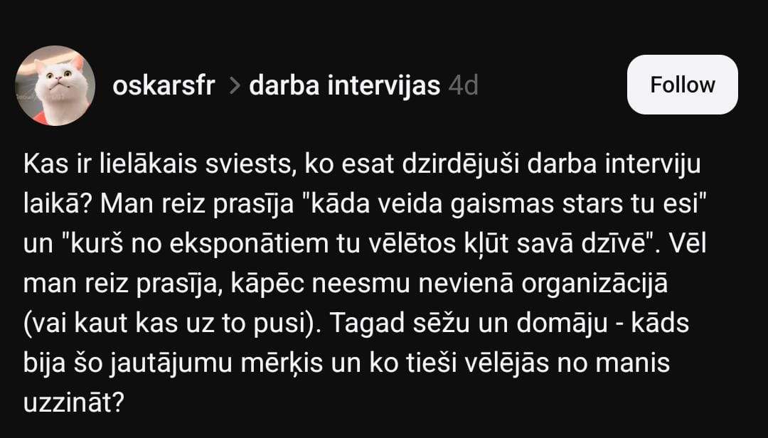 Sociālo mediju platformā “Threads” lietotājs Oskars dalījies savā pieredzē un uzdevis jautājumu citiem: “Kas ir lielākais sviests, ko esat dzirdējuši darba interviju laikā?