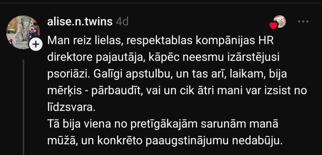 Savukārt Līgas pieredze izklausās īpaši mulsinoša: “Man pajautāja, vai esmu par vai pret Covid vakcīnām. Un vai esmu pamanījusi, cik daudz ķīmisko trašu ir debesīs. Tad sekoja monologs par viņas uzskatiem. Firma nebija maza, nerakstīšu kura, bet biju šokā. Pēc tās reizes algotā darbā beztermiņa baidos kandidēt – labāk pati sev darbu nodrošinu.”