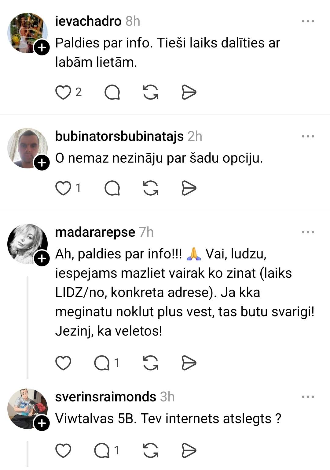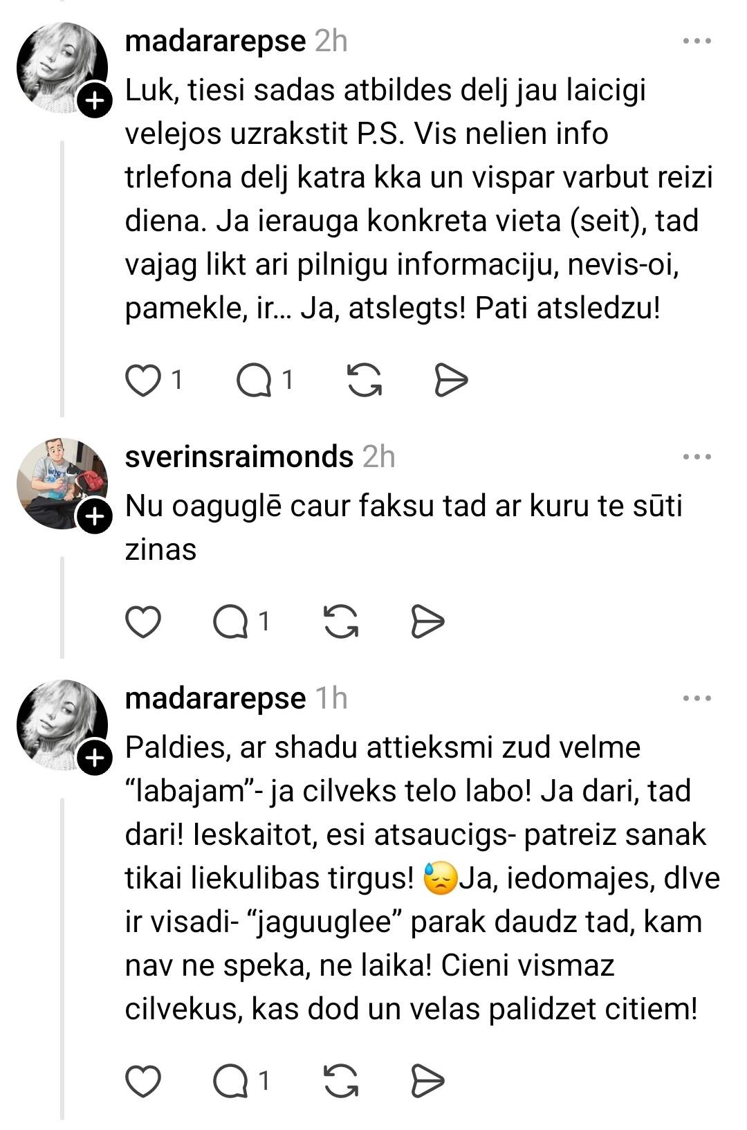 Diskusijā gan parādās arī asāki viedokļi. Kāds lietotājs ironiski norāda, ka informāciju var vienkārši sameklēt internetā, kas savukārt izsauc neapmierinātību no citiem – viņi uzsver, ka ne visiem ir laiks vai iespējas visu meklēt pašiem, un tieši tāpēc šādi ieraksti sociālajos tīklos ir tik nozīmīgi.