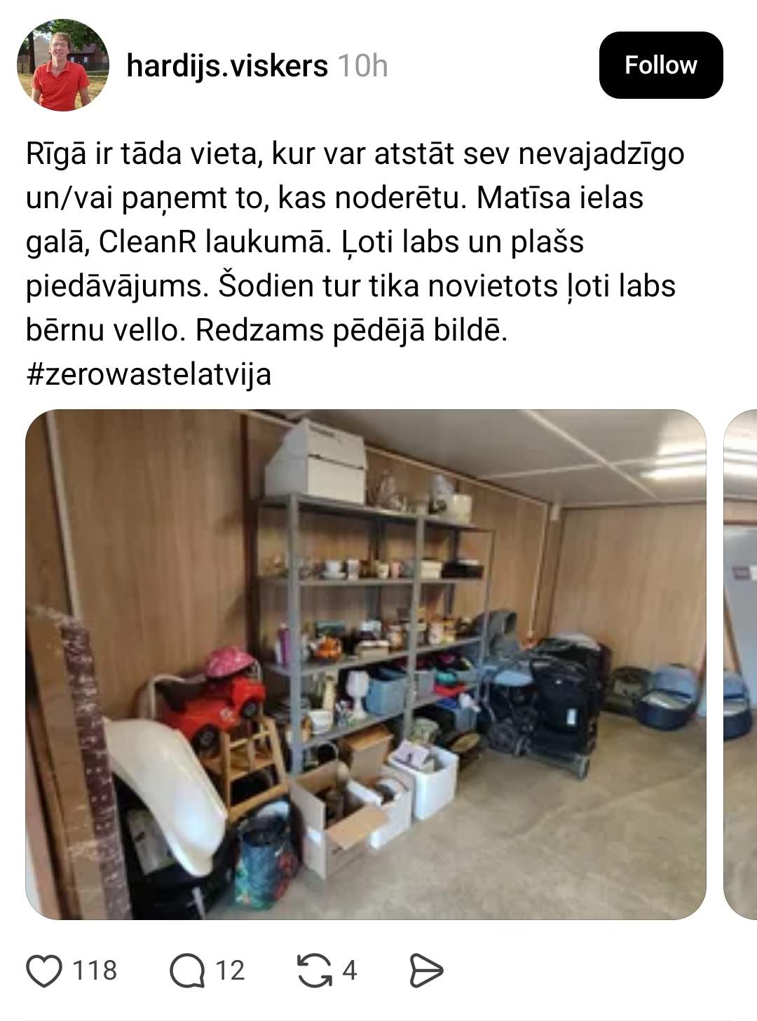 Laikā, kad dzīves dārdzība turpina pieaugt un daudzi vēl joprojām izjūt ziemas nenormāli augsto rēķinu sekas, arvien nozīmīgāka kļūst cilvēku savstarpēja palīdzība. Situācijā, kad ne visiem pietiek līdzekļu pat ikdienā nepieciešamajam, īpaši vērtīgas kļūst iniciatīvas, kas ļauj gan ietaupīt, gan dalīties ar citiem. Kāds vīrietis sociālajos tīklos atklāj vietu Rīgā, kur var bez maksas saņemt un atstāt noderīgas lietas.