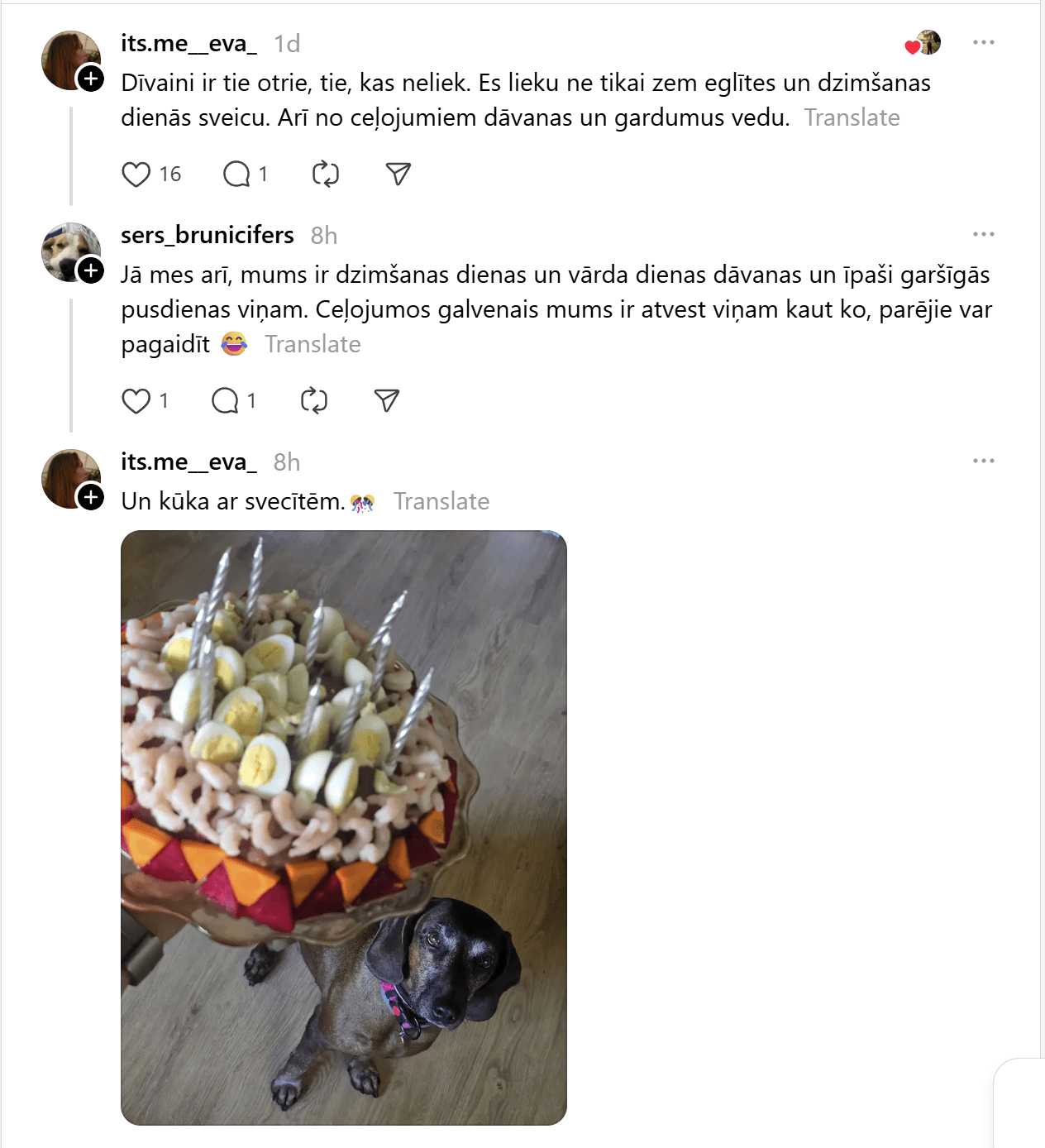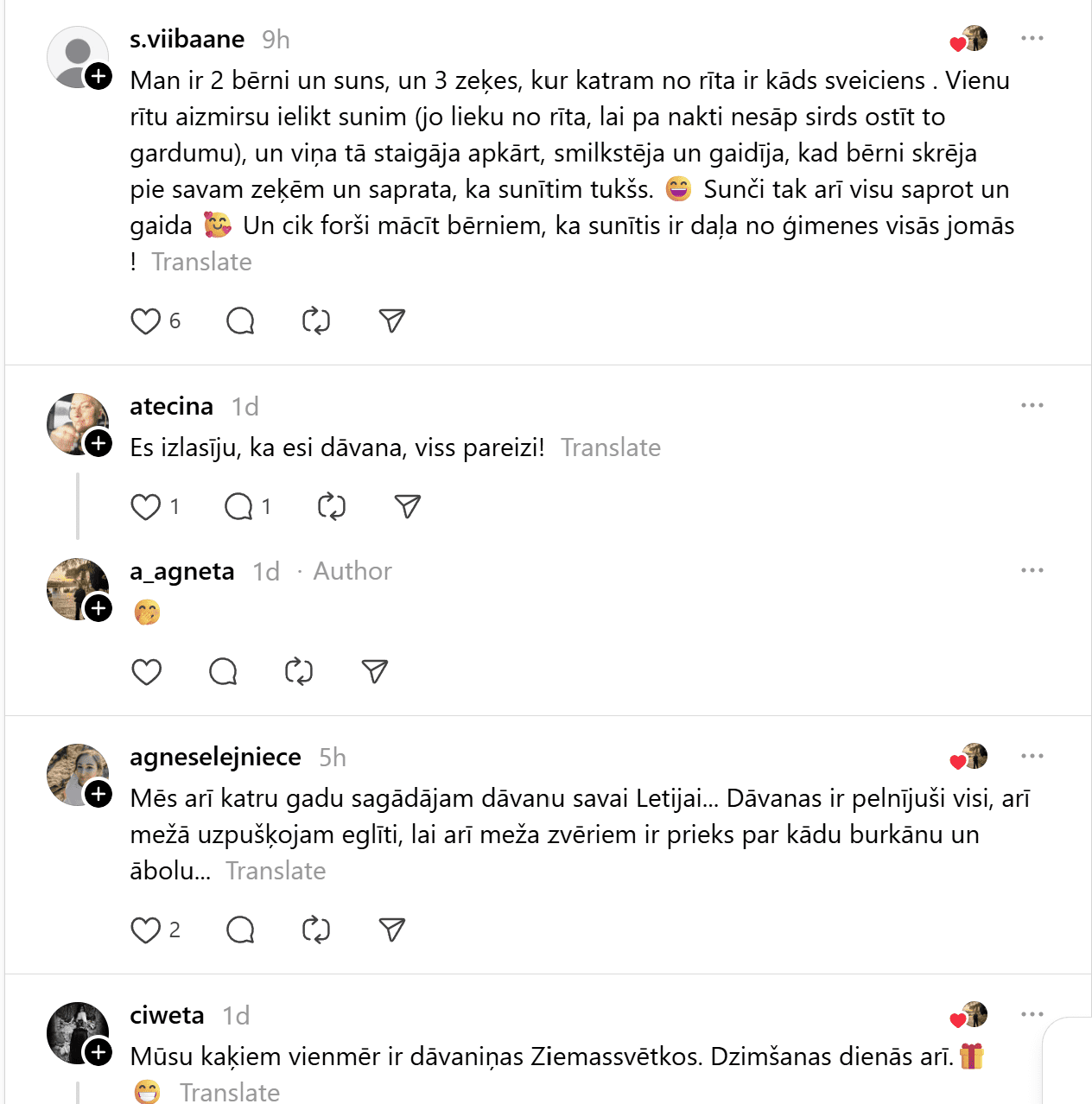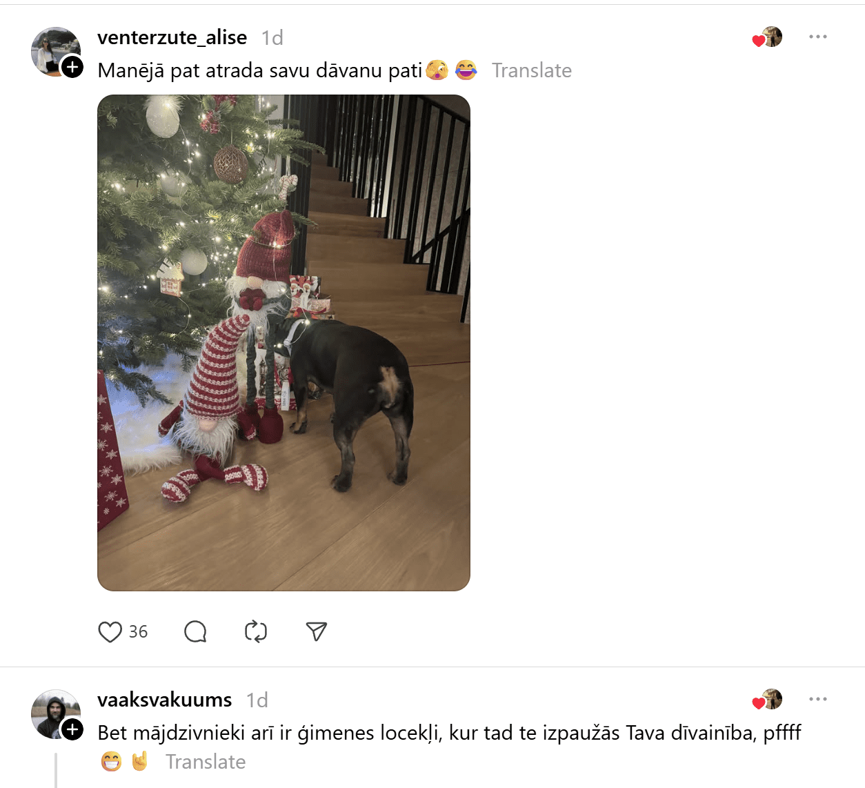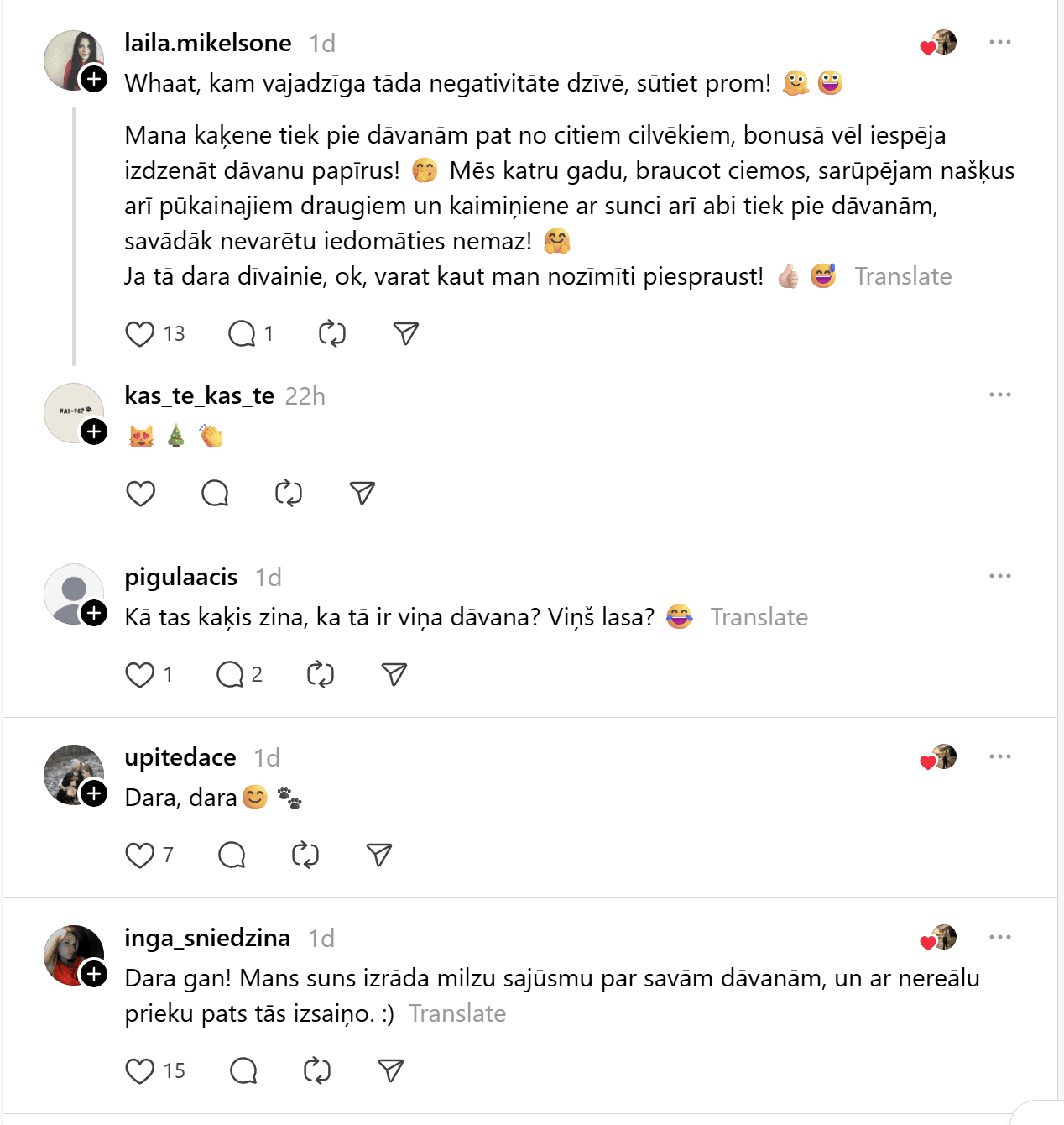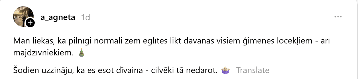 Viņa raksta: “Man liekas, ka pilnīgi normāli zem eglītes likt dāvanas visiem ģimenes locekļiem – arī mājdzīvniekiem. Šodien uzzināju, ka es esot dīvaina – cilvēki tā nedarot.”
