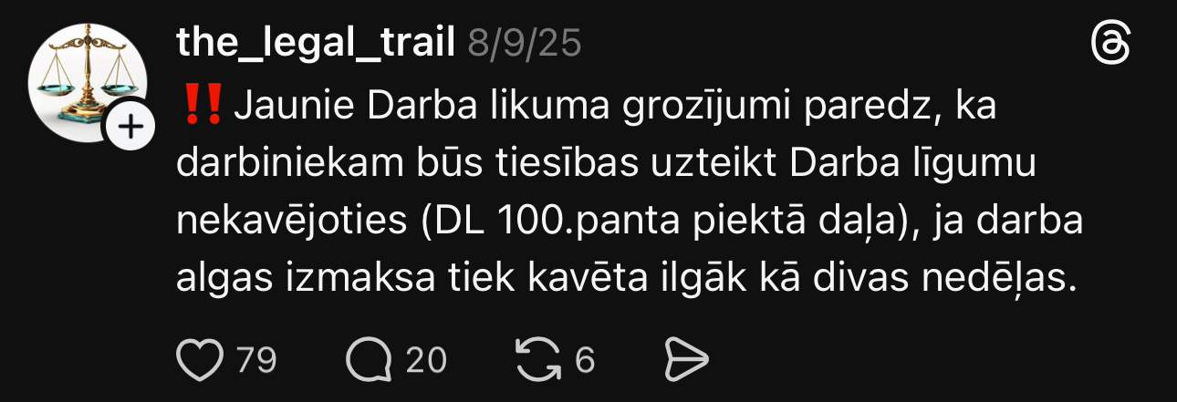 Profils @the_legal_trail platformā “Threads” augusta sākumā vēstīja, ka Darba likumā ir jauni grozījumi, kas paredz tiesības darbiniekam nekavējoties uzteikt darbu, ja darba algas izmaksa tiek kavēta ilgāk nekā divas nedēļas.