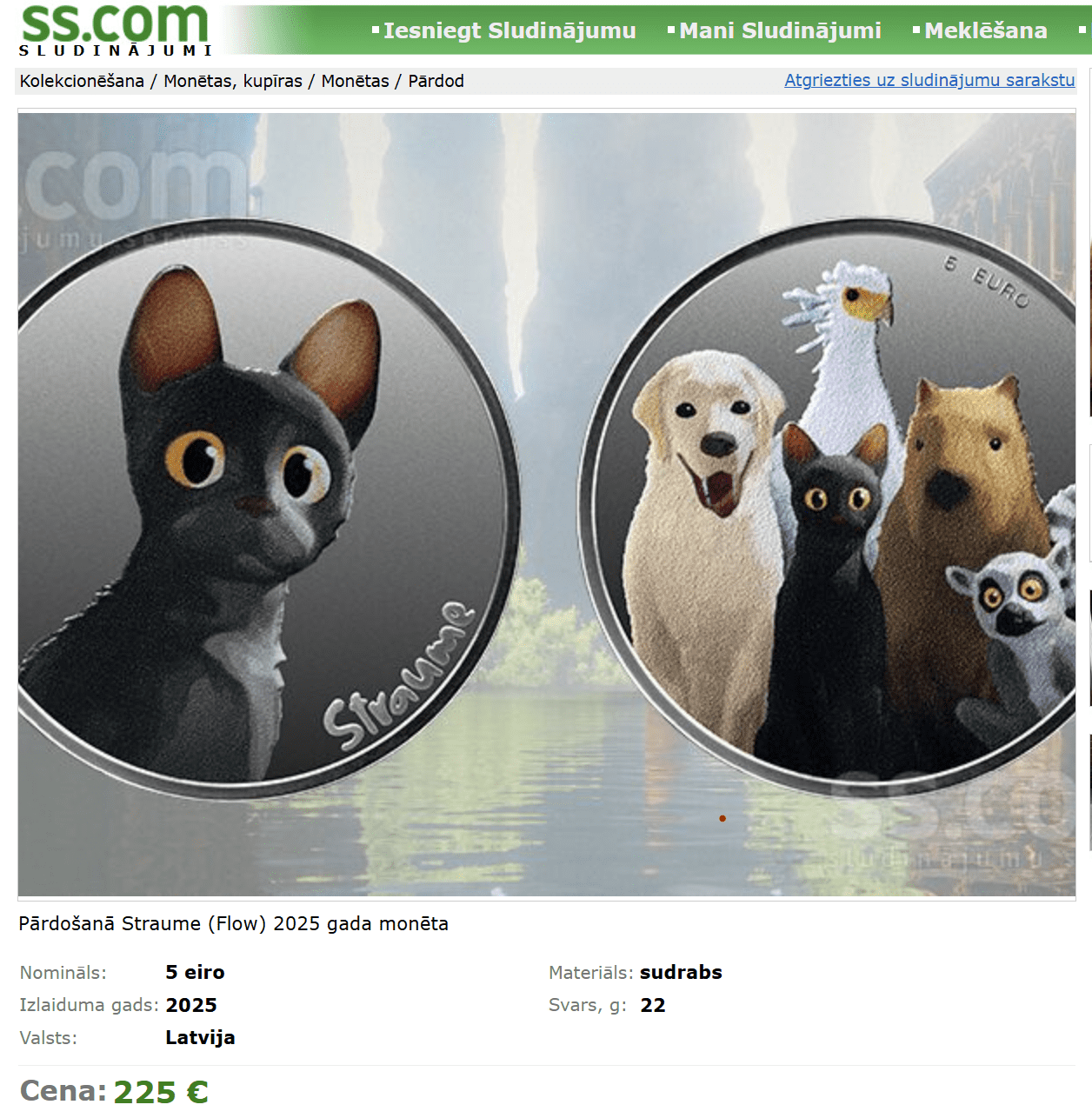 Trešdien, 10. decembrī, Latvijas Banka izlaida sudraba kolekcijas monētu “Straume”, kas veltīta animācijas filmai, kas ieguvusi ASV Kinoakadēmijas balvu “Oskars”. Monētā attēloti filmas tēli, kas iekarojuši skatītāju sirdis visā pasaulē, un tās grafisko dizainu radījuši filmas režisors Gints Zilbalodis un animācijas mākslinieks Pēteris Tenisons.