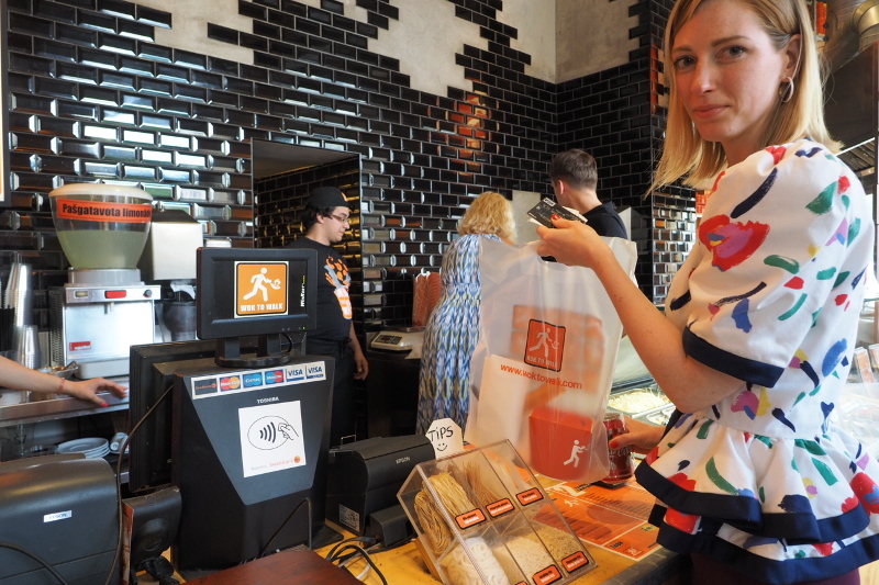 Pirmais bezkontakta norēķinu terminālis uzstādīts ātrās apkalpošanas restorānā “Wok to Walk” Aspazijas bulvārī 30, Rīgā.