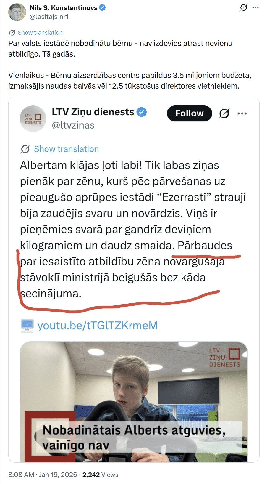Pusaudžu un jauniešu psihoterapijas centra vadītājs Nils Konstantinovs asi kritizējis valsts institūciju rīcību saistībā ar gadījumu, kurā valsts aprūpes centrā gandrīz līdz nāvei tika novārdzināts jaunietis ar smagiem attīstības traucējumiem. “Par valsts iestādē nobadinātu bērnu – nav izdevies atrast nevienu atbildīgo. Tā gadās,” tērzēšanas platformā “X” ironiski raksta Konstantinovs.