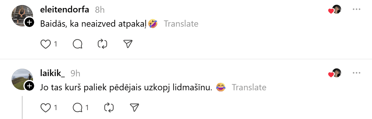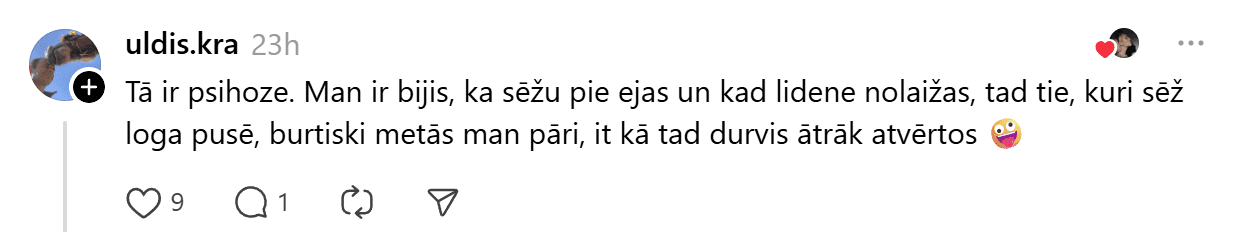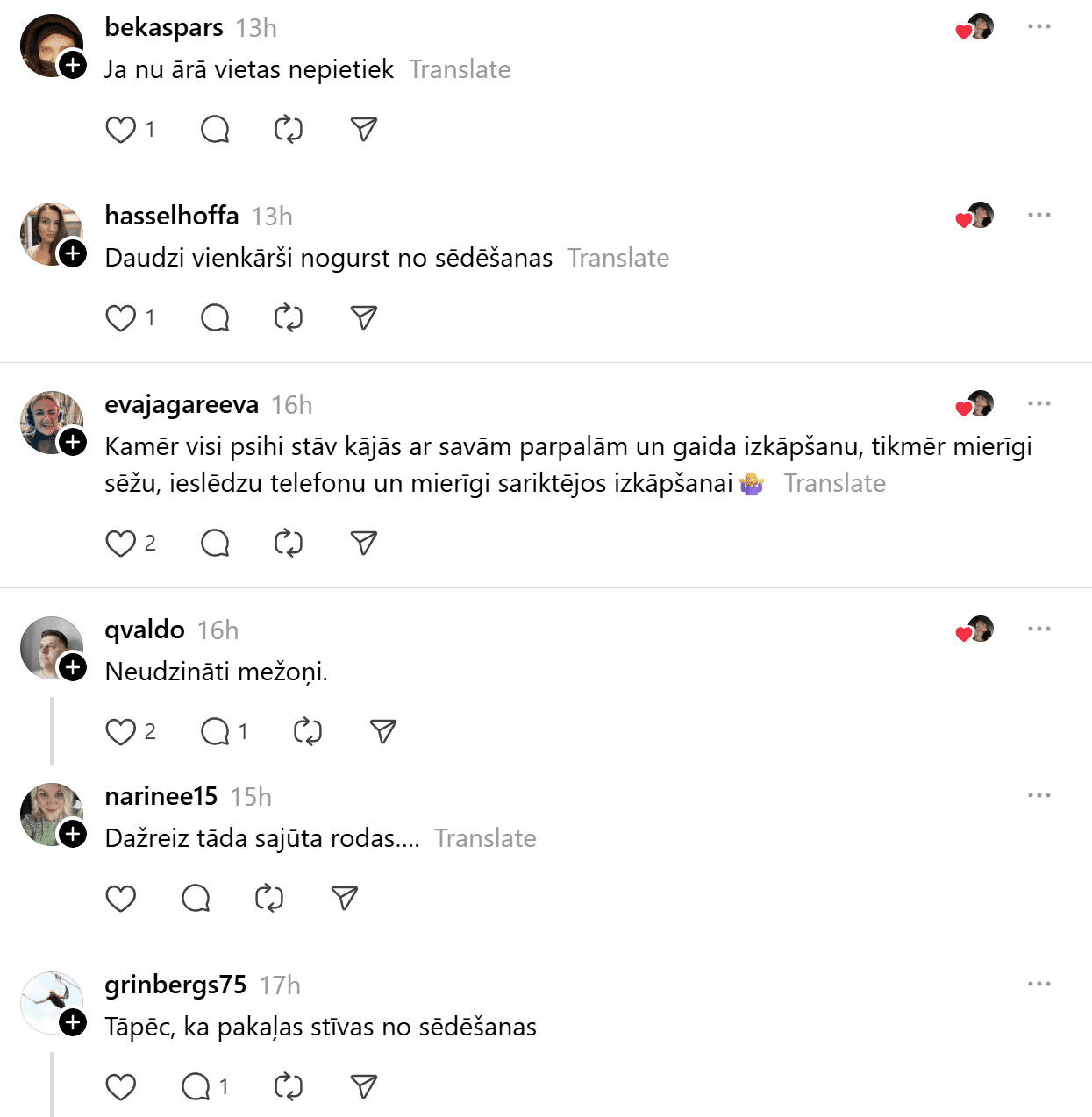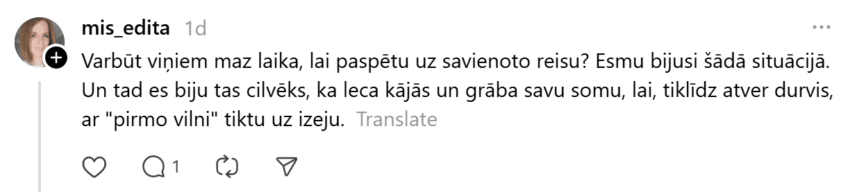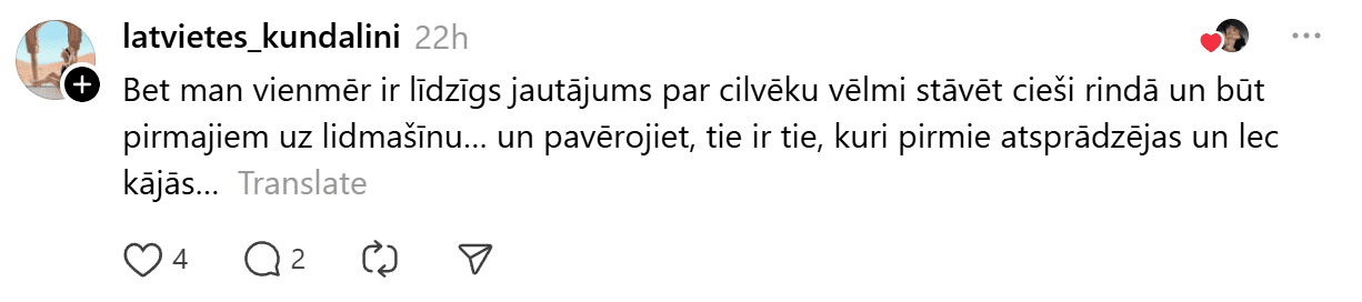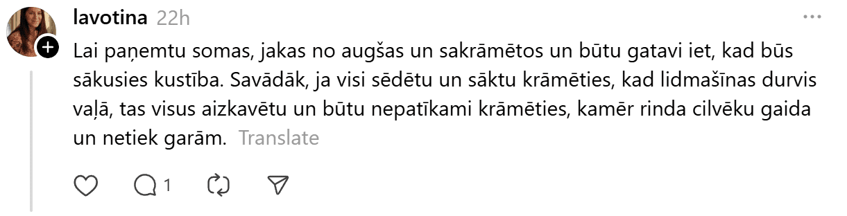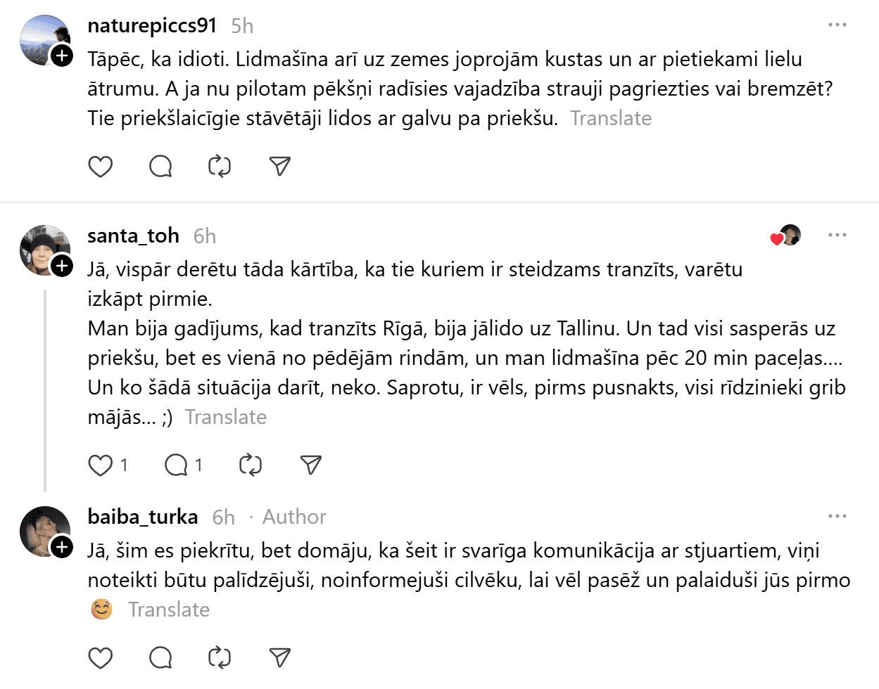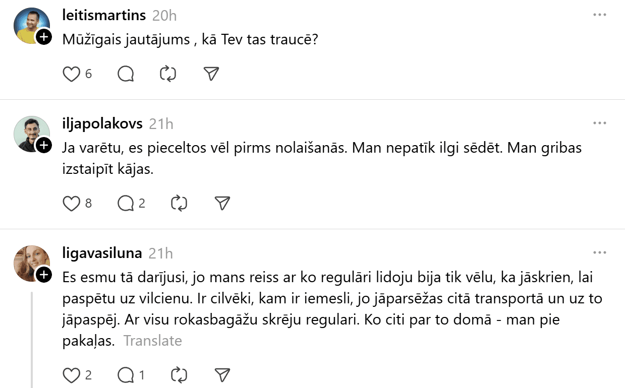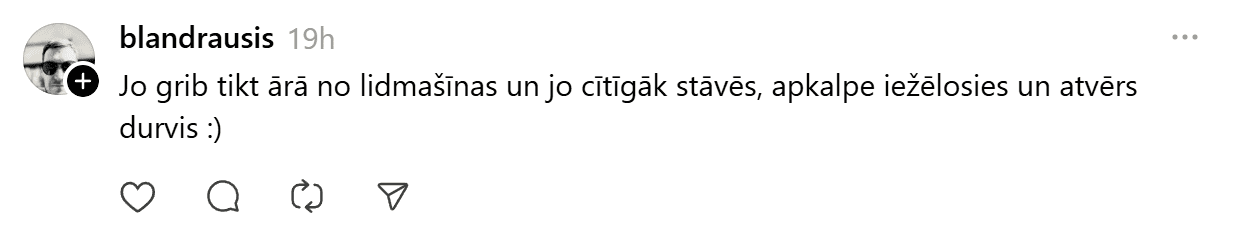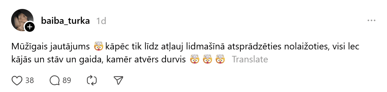 “Mūžīgais jautājums – kāpēc tik līdz atļauj lidmašīnā atsprādzēties nolaižoties, visi lec kājās un stāv, un gaida, kamēr atvērs durvis,” sociālā tīkla “Threads” platformā vaicā kāda sieviete.