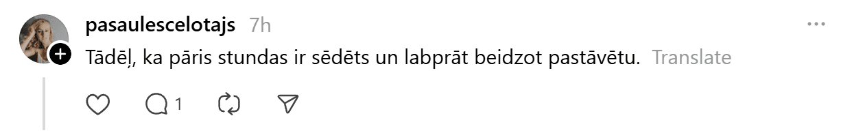 Tāpat eksperti norāda, ka pēc ilgstošas sēdēšanas cilvēkiem vienkārši ir fiziska vajadzība piecelties, izstaipīties un izkustēties. Tas palīdz arī mazināt diskomfortu un uzlabo pašsajūtu.