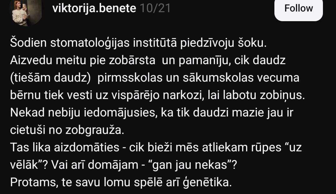 “Šodien Stomatoloģijas institūtā piedzīvoju šoku,” raksta sieviete. “Aizvedu meitu pie zobārsta un pamanīju, cik daudz (tiešām daudz) pirmsskolas un sākumskolas vecuma bērnu tiek vesti uz vispārējo narkozi, lai labotu zobiņus.”
