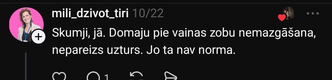 Arī Līga piedalās diskusijā un pauž savu viedokli: “Ģenētikai nekāda sakara, bet gan tas ko tie bērni ēd, ja palasa “Threads” bērns dienu sāk ar “Kārums” sieriņiem, suliņām, “Actimeliem” un visādiem citādiem draņķiem, tad jānotiek brīnumam, lai šiem bērniem būtu veseli zobi.”
