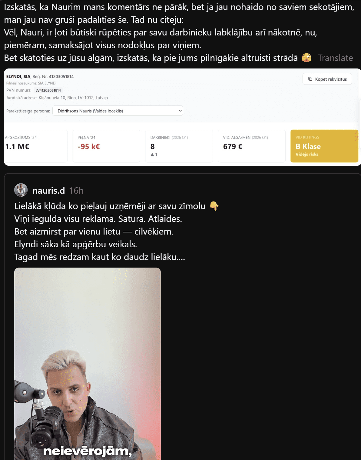 Nauris Didrihsons kopā ar sievu Elīnu Didrihsoni un viņu uzņēmums “Elindy” jau ilgstoši ir vieni no redzamākajiem vārdiem Latvijas sociālajos tīklos. Viņu aktivitātes, izteikumi un biznesa attīstība regulāri izraisa plašas diskusijas, un arī šoreiz nav izņēmums – uzmanības centrā nonākuši jautājumi par uzņēmuma darbinieku atalgojumu un attieksmi pret personālu.
