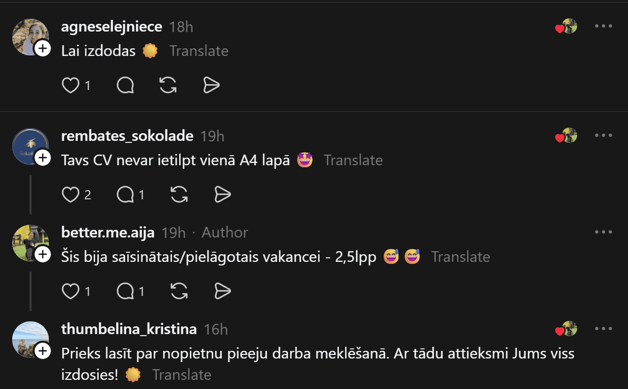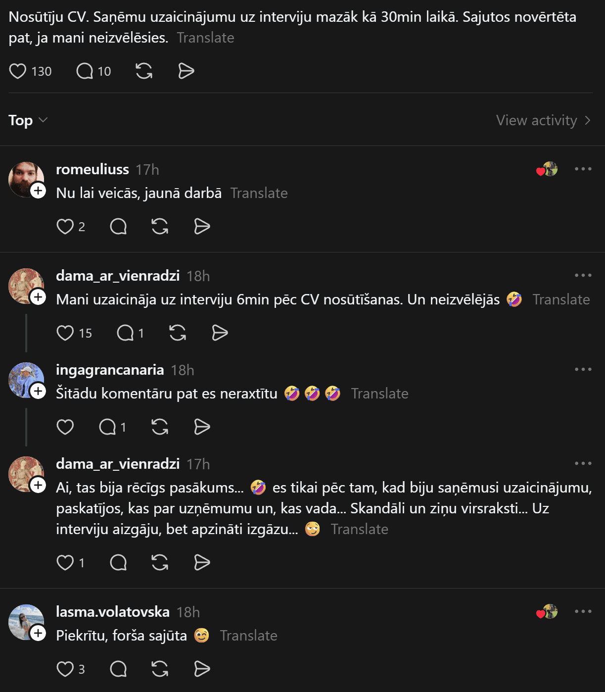 Darba meklēšana Latvijā daudziem kļuvusi par īstu pārbaudījumu. Lai gan sludinājumu netrūkst, realitātē ceļš līdz darba līgumam bieži ir ilgs un nogurdinošs – uz desmitiem nosūtītu CV nereti neseko neviena atbilde vai arī tā pienāk tikai pēc vairākām nedēļām. Daļa darba devēju meklē “ideālo kandidātu”, prasot gan pieredzi, gan prasmes, kas ne vienmēr atbilst piedāvātajam atalgojumam. Tikmēr darba meklētāji spiesti pielāgoties, pārkvalificēties vai pat apsvērt iespēju doties strādāt uz ārzemēm, jo Latvijā atrast stabilu un labi apmaksātu darbu joprojām nav vienkārši. Sociālajos tīklos ar savu pieredzi padalījusies kāda sieviete, kuras pieredze ir krasi pretēja vairākumam – viņu uz darba interviju uzaicināja ļoti ātri!
