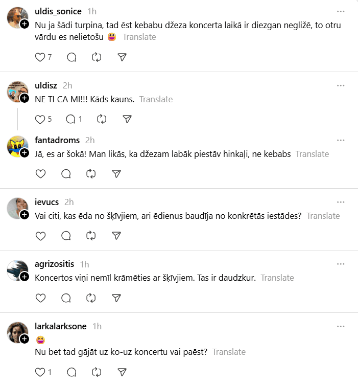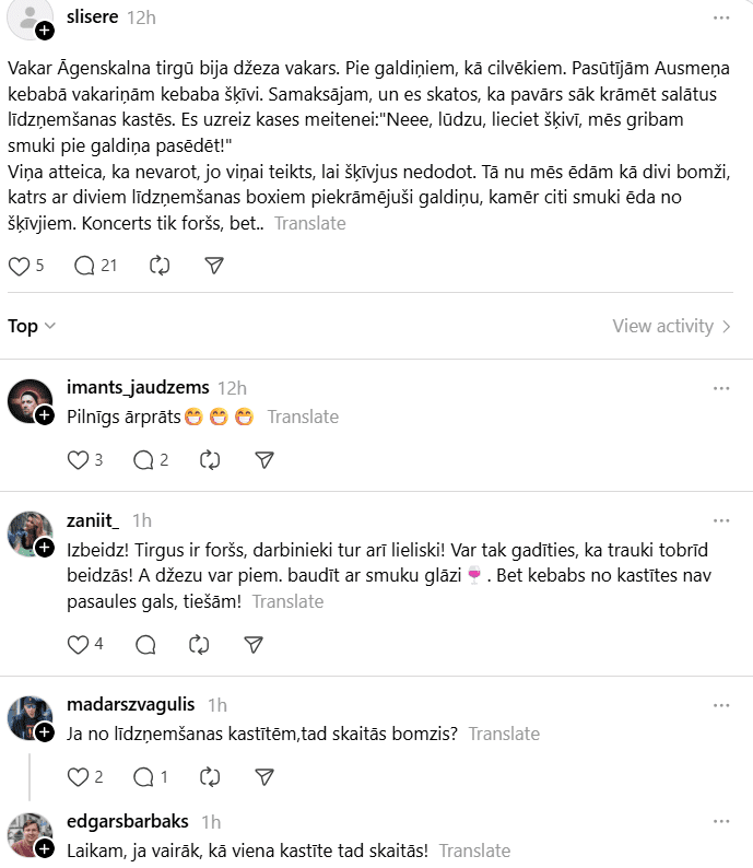 “Vakar Āgenskalna tirgū bija džeza vakars. Pie galdiņiem, kā cilvēkiem. Pasūtījām Ausmeņa kebabā vakariņām kebaba šķīvi. Samaksājam, un es skatos, ka pavārs sāk krāmēt salātus līdzņemšanas kastēs. Es uzreiz kases meitenei:”Neee, lūdzu, lieciet šķivī, mēs gribam smuki pie galdiņa pasēdēt!” Viņa atteica, ka nevarot, jo viņai teikts, lai šķīvjus nedodot. Tā nu mēs ēdām kā divi bomži, katrs ar diviem līdzņemšanas boxiem piekrāmējuši galdiņu, kamēr citi smuki ēda no šķīvjiem. Koncerts tik foršs, bet..” Līga raksta.