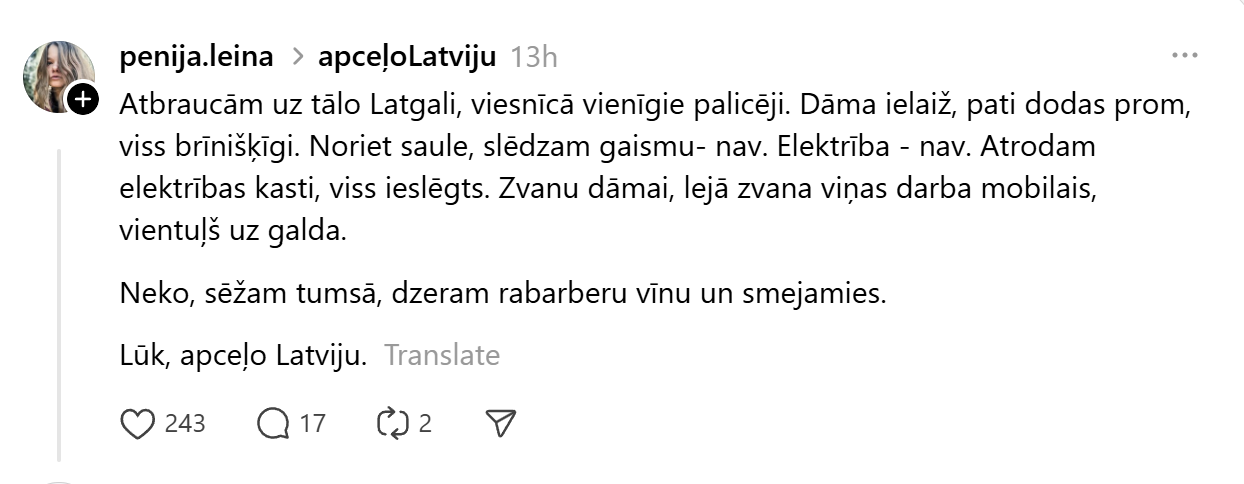 “Atrodam elektrības kasti, viss ieslēgts. Zvanu dāmai, lejā zvana viņas darba mobilais, vientuļš uz galda. Neko, sēžam tumsā, dzeram rabarberu vīnu un smejamies,” sieviete atklāj piedzīvoto.