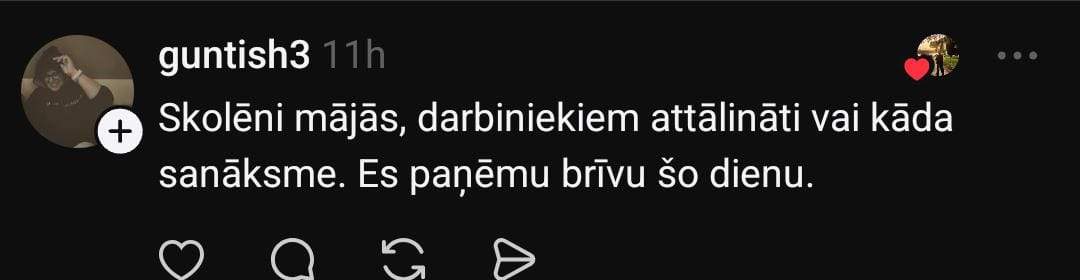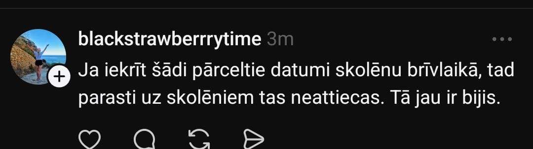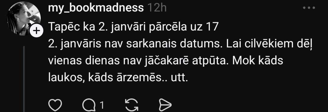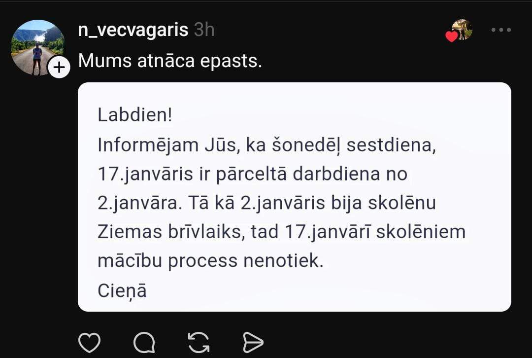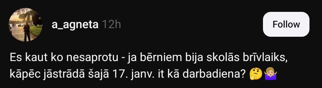 Arī sabiedrībā šis jautājums raisījis diskusijas sociālajos tīklos. Kāda mamma sociālo mediju platformā “Threads” raksta: “Es kaut ko nesaprotu – ja bērniem bija skolās brīvlaiks, kāpēc jāstrādā šajā 17. janvārī it kā darbadiena?”
