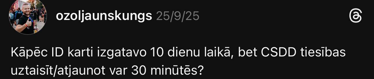 Ralfs platformā “Threads” uzdevis visai interesantu jautājumu: “Kāpēc ID karti izgatavo 10 dienu laikā, bet CSDD tiesības uztaisīt/atjaunot var 30 minūtēs?”